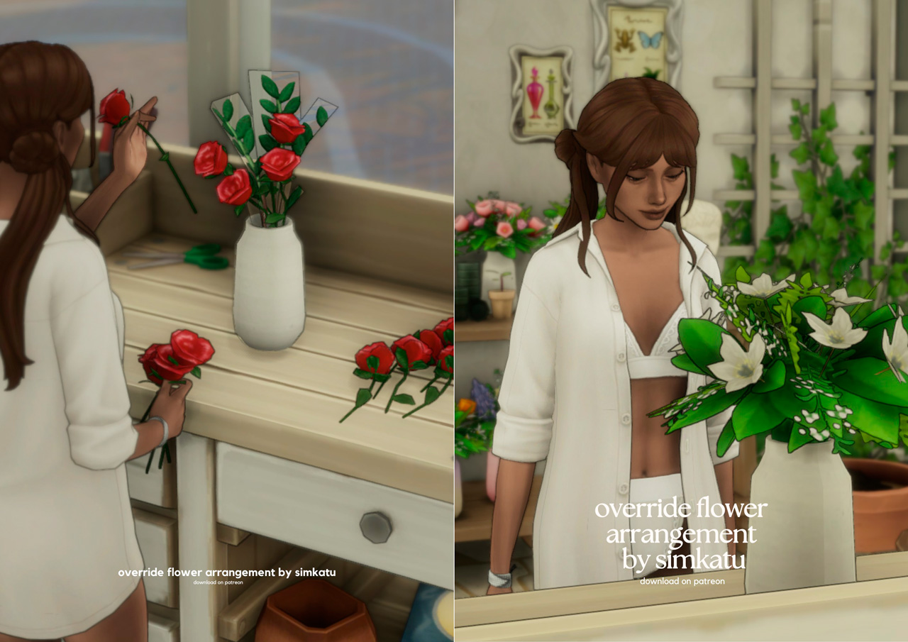 В мире The Sims цветы — это не просто декор, а целая симфония эмоций и стиля! Представьте: вы стоите у флористского стола, собираете букет из нежных лепестков, и вдруг… магия! Наш новый мод «Override Flower Arrangement» от Simkatu превращает обычные букеты в шедевры цифрового искусства. Забудьте о стандартных моделях — теперь горшки с цветами обретают реалистичные текстуры, лепестки переливаются объёмом, а ароматы (да-да, те самые индикаторы запаха) остаются на месте, чтобы ваши симы могли наслаждаться каждым вдохом.