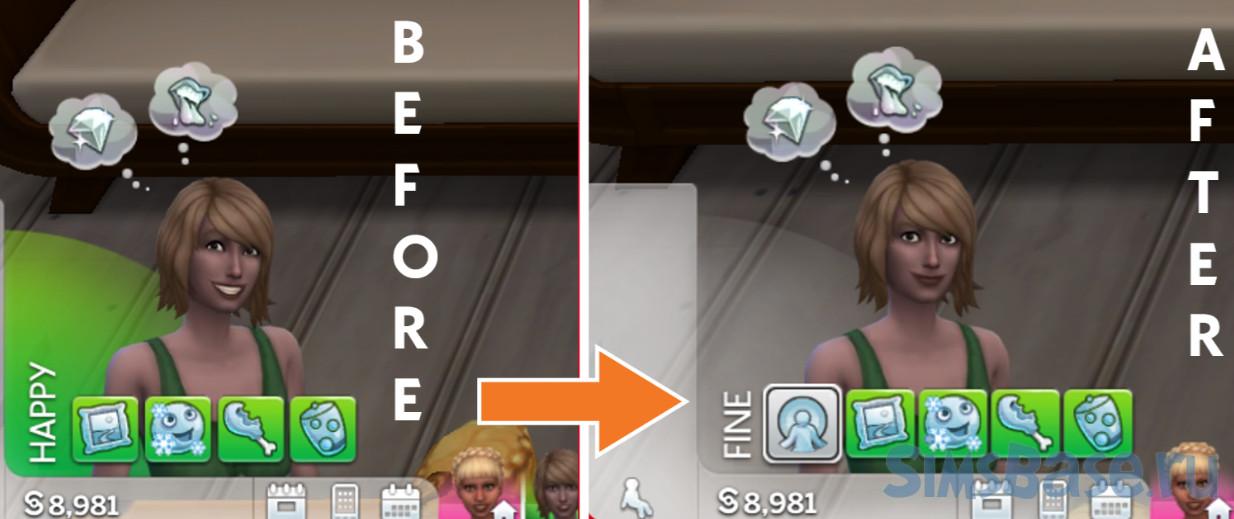 До сих пор в игре есть никогда не обновлявшаяся и неработающая система эмоций, которая широко рекламировалась при запуске игры и, в конце концов, потерпела огромный провал. Этот мод выполняет множество функций в фоновом режиме и главное, теперь эмоции работают иначе, их больше и они совсем иначе влияют на жизнь симов.