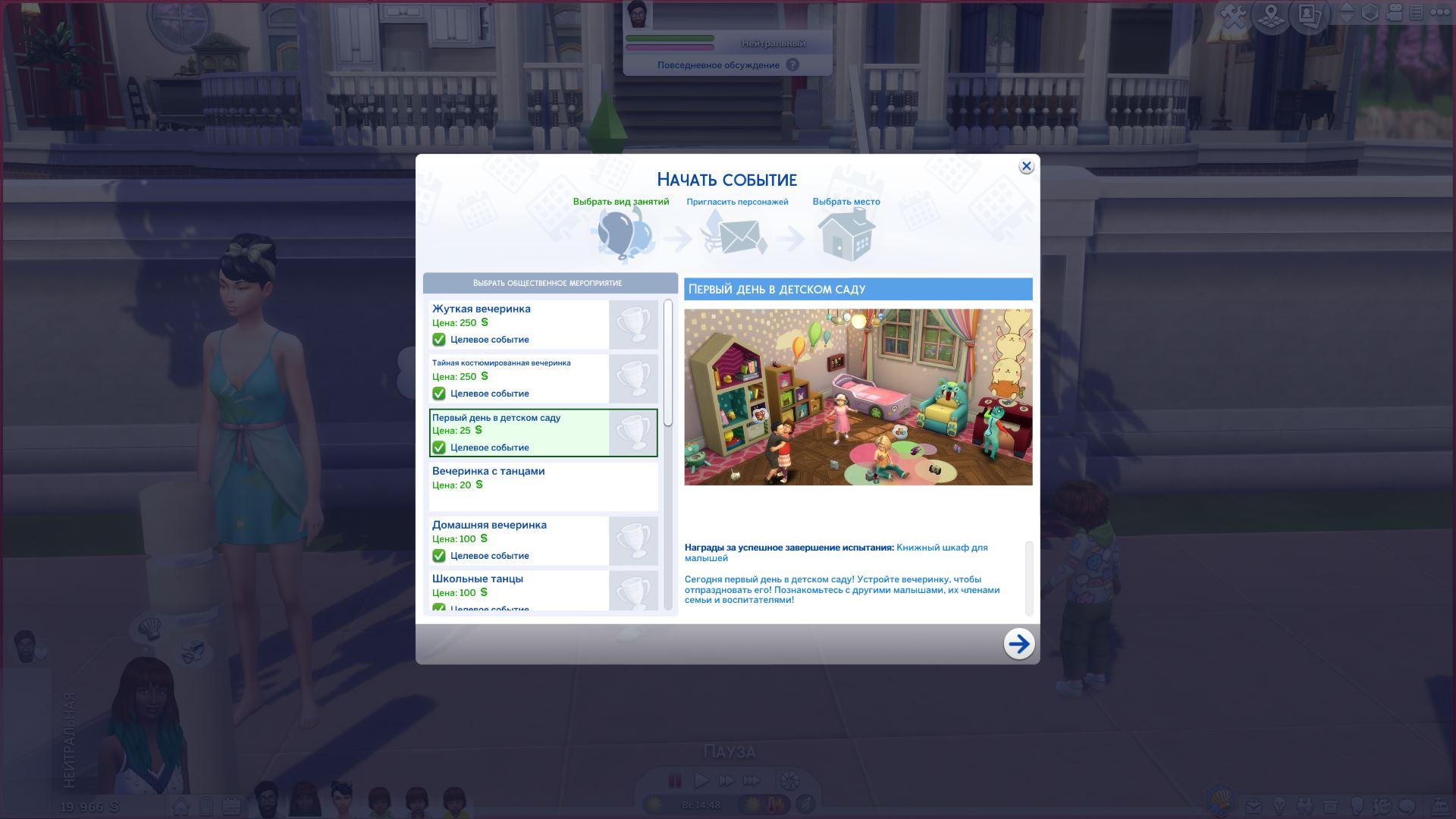 Данный мод добавляет планируемое мероприятие «Первый день в детском саду». Разумеется, что оно предназначается для малышей, родителей и воспитателей. Задачи будут простыми: познакомиться с воспитателями, вместе скушать тортик, рассказать истории, проверить малышей, распитие лимонада и так далее. Если вы отыгрываете сюжеты разные, то такое мероприятие отлично впишется в вашу игру.
