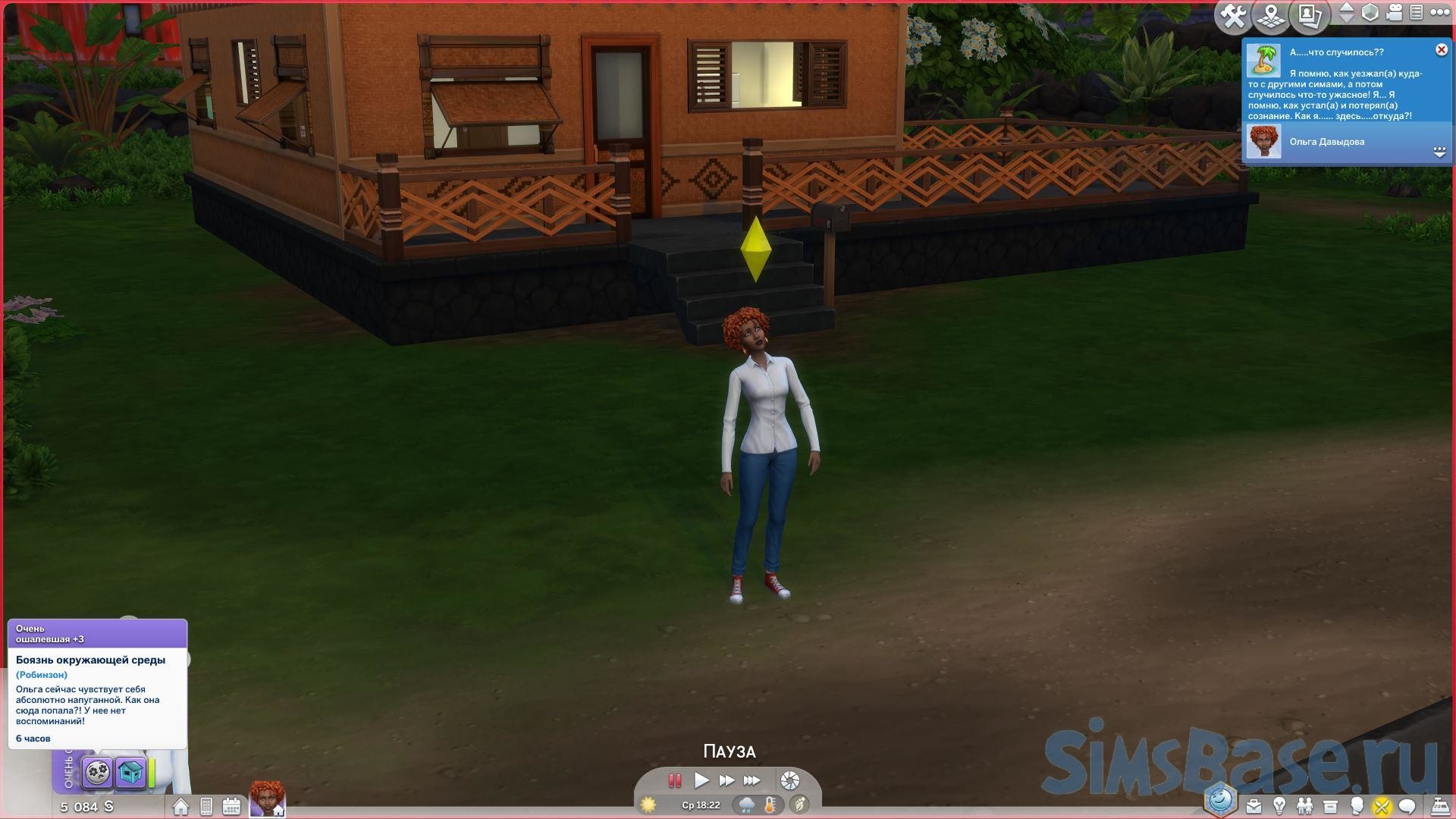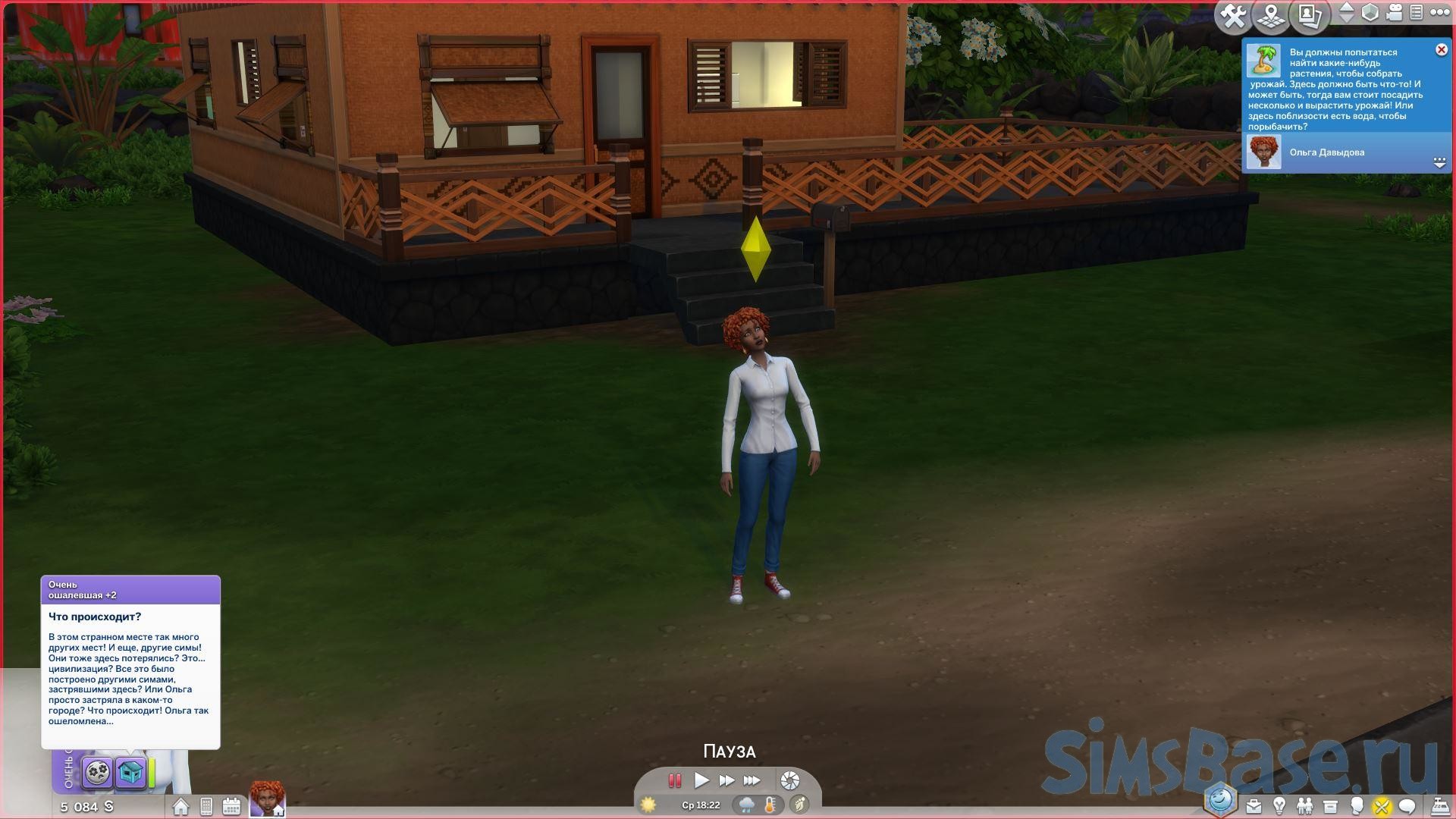 Как только сим прибудет на участок, он получит системное уведомление о том, что… он потерялся, заблудился, и как вообще он тут оказался?! В результате его ожидают 5 баффов, которые могут сразу все появиться, а могут и частями. Это и бафф ошеломленного состояния, который будет присутствовать всегда у гостей или жителей в этом месте, и новые взаимодействия при общении с другими симами, даже от использования кустика, рыбалки, сна в палатке, сбора или посадки урожая – тоже будут свои необычные баффы стресса, счастья, замешательства.