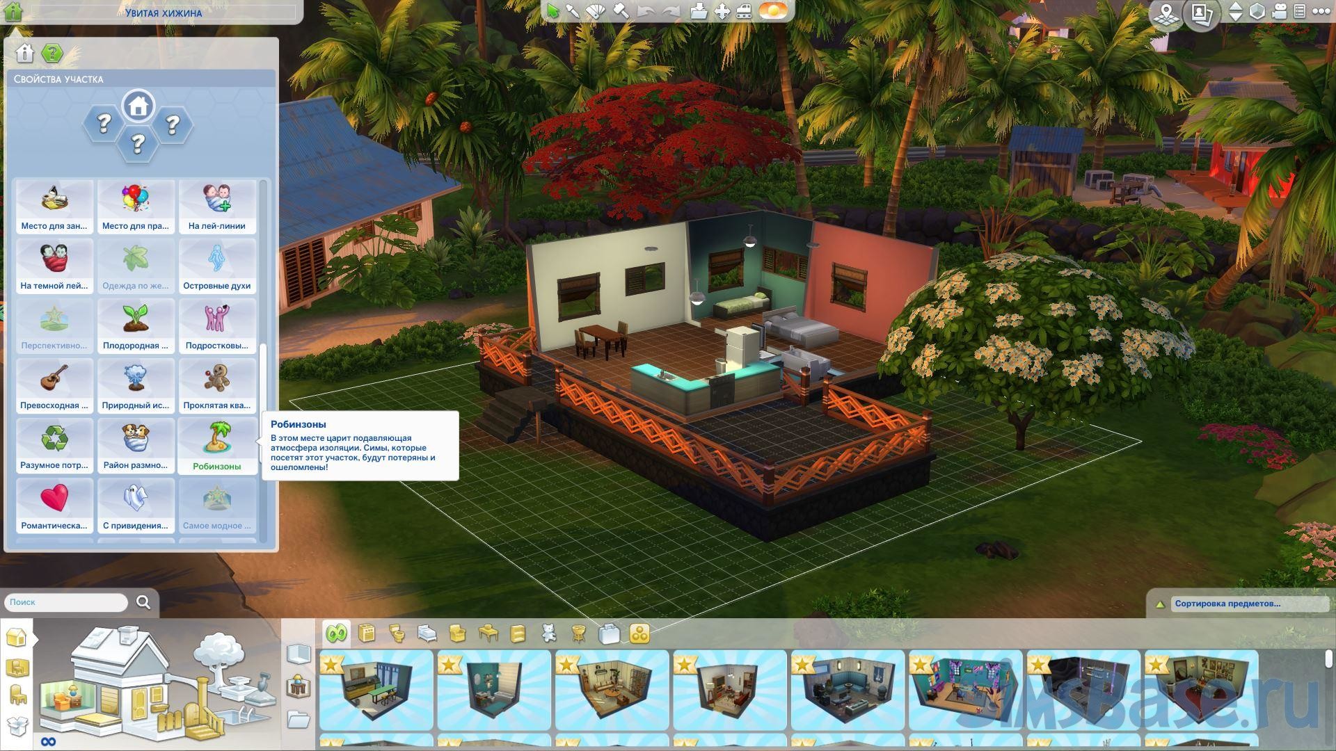 Данный мод добавляет новое свойство участка «Робинзоны» и лучше всего оно работает в сочетании со свойством «Жизнь без удобств». Особенность свойства: на участке царит изоляция. Все, кто забрел в эти края – теряются.