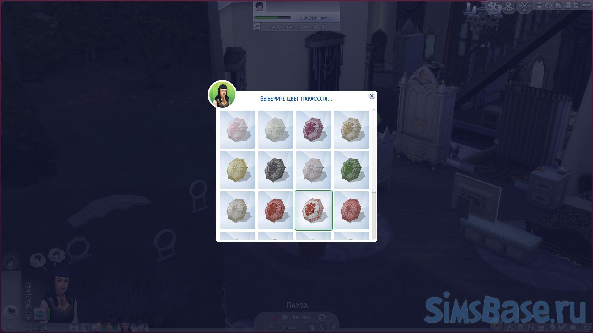 Теперь симы могут выбрать «Открыть Парасоль» в меню «Регентство». Доступно 20 образцов, и он работает именно как зонтик, но не переопределяет зонтик.