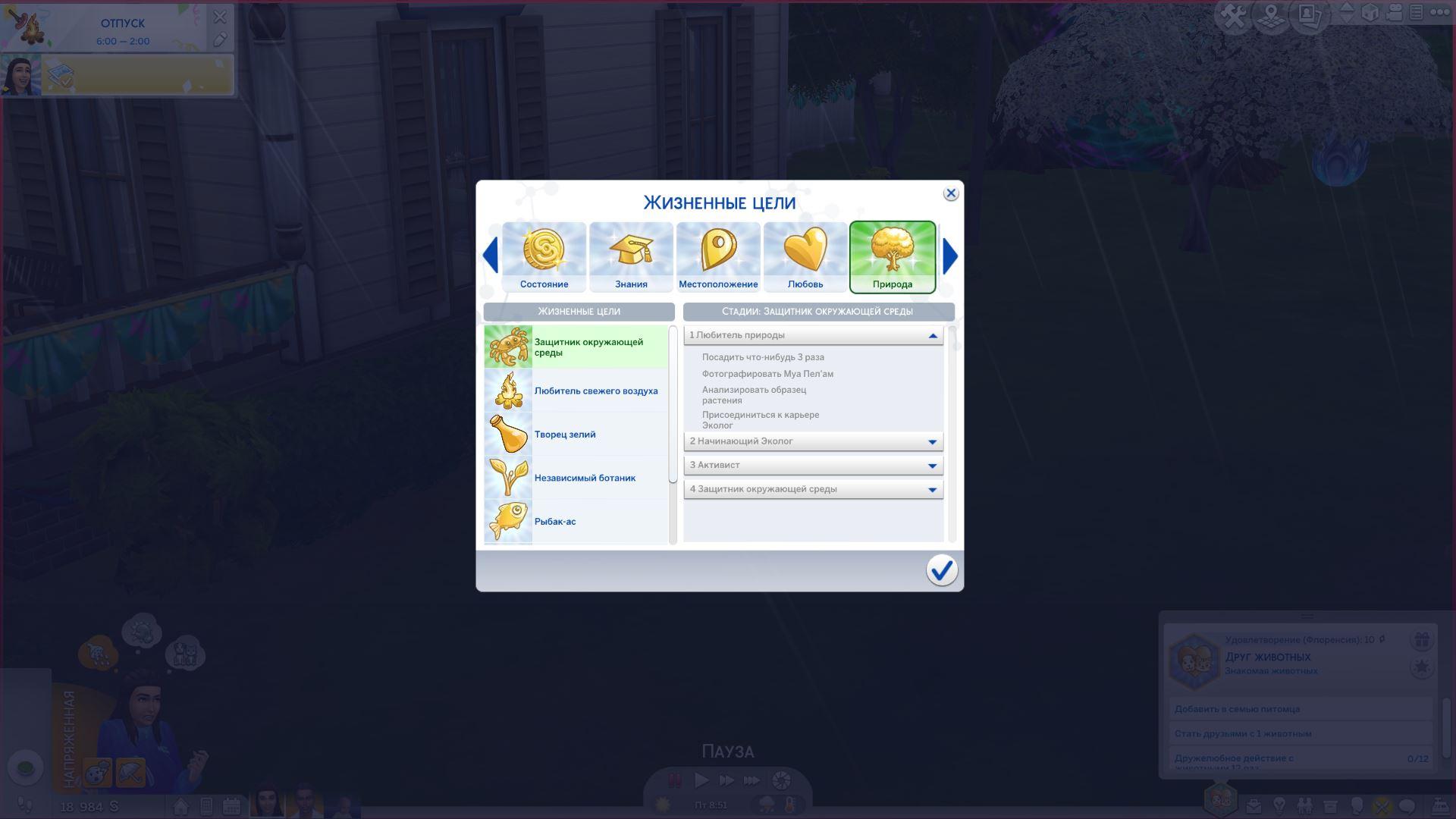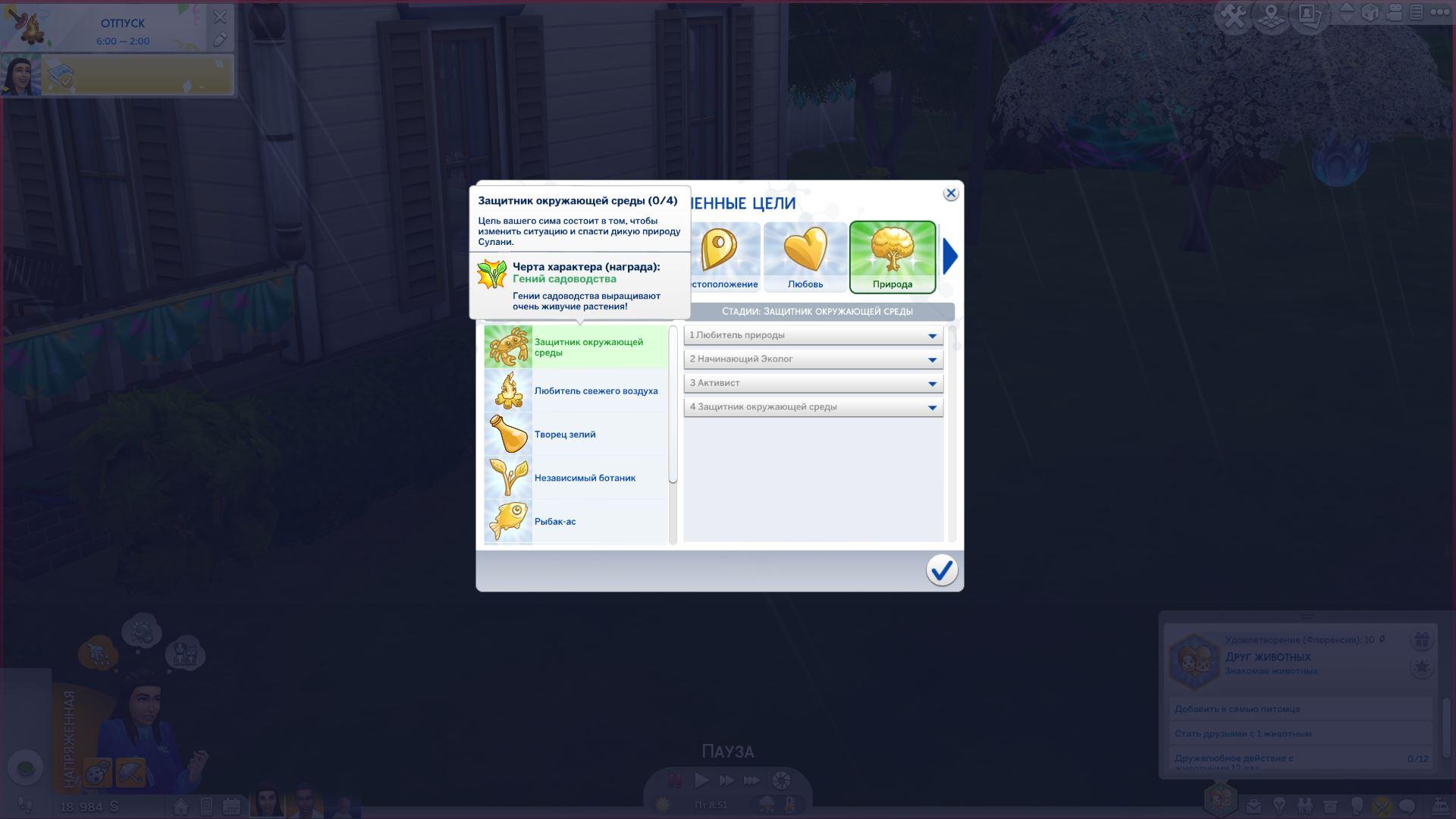 Данный мод добавляет жизненную цель «Защитник окружающей среды», которая похожа отчасти на карьеру эколога. Если быть откровенными, то она создавалась специально для этой карьеры и даже требует её, ведь тогда погружение в мир Сулани и работу станет более глубоким.