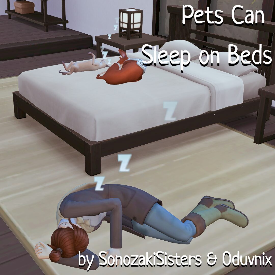 Этот модификация вводит новую функцию, позволяя всем животным из дополнения «Кошки и Собаки» (включая взрослых собак, щенков и котят) использовать кровати как места для сна.