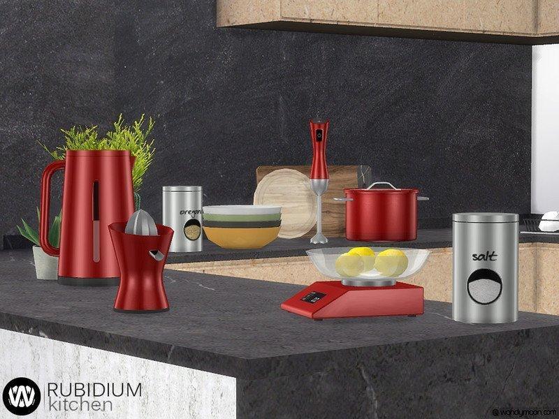 Набор современных строгих по форме декораций для кухни. Все предметы созданы в красном цвете, бежевом, сером. Включает: чайник, люстру, блендер, специи, салатник, разделочную доску, кастрюльки, и многое другое.
