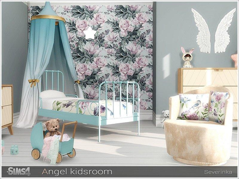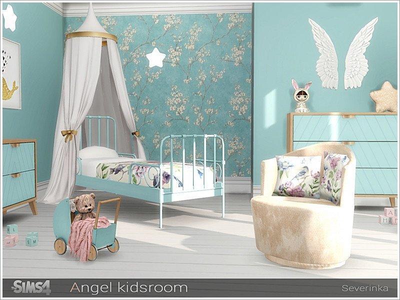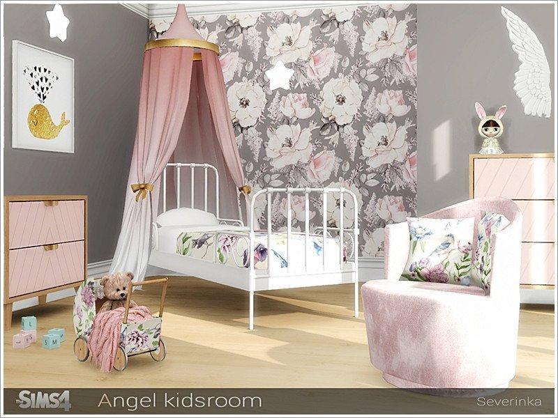 В наборе: односпальная кровать, балдахин, кресло с подушками, кресло без подушек, комод, прикроватная тумбочка, коляска для кукол, постер, крылья ангела на стену, светильник в форме звезды, настенный светильник, напольная лампа, два набора покрытия стен.
