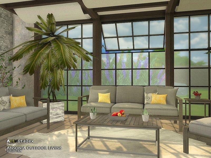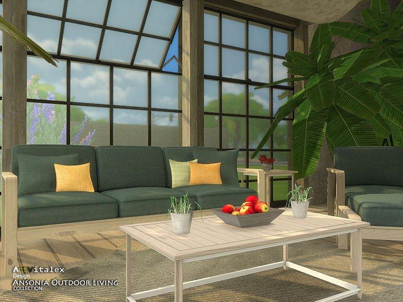 В наборе: два варианта навесов, диванные подушки в двух вариантах, кресло, пуфик, диваны: двухместный и трехместный, кофейный столик, тумбочка, ковер, напольный светильник.