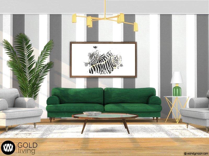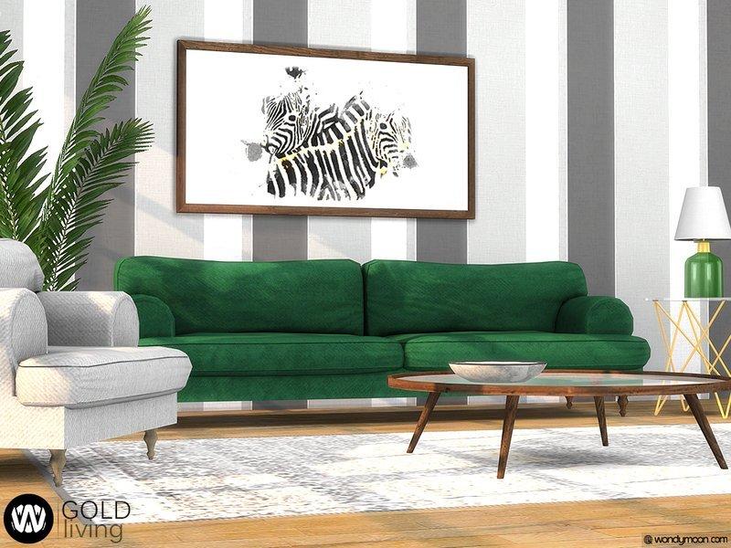 В наборе: уютный диван, мягчайшее кресло, симпатичный кофейный столик, изящная тумбочка, куст папоротника, потолочный светильник, акварель с зебрами, керамическая мисочка и ковер.
