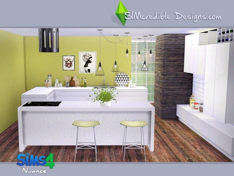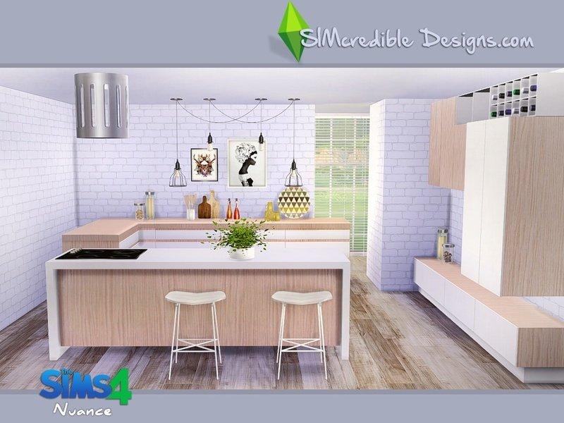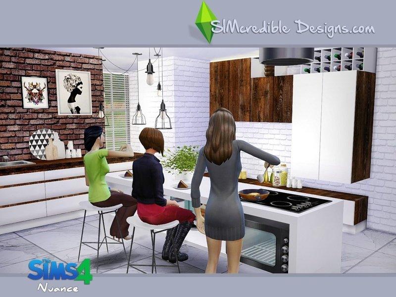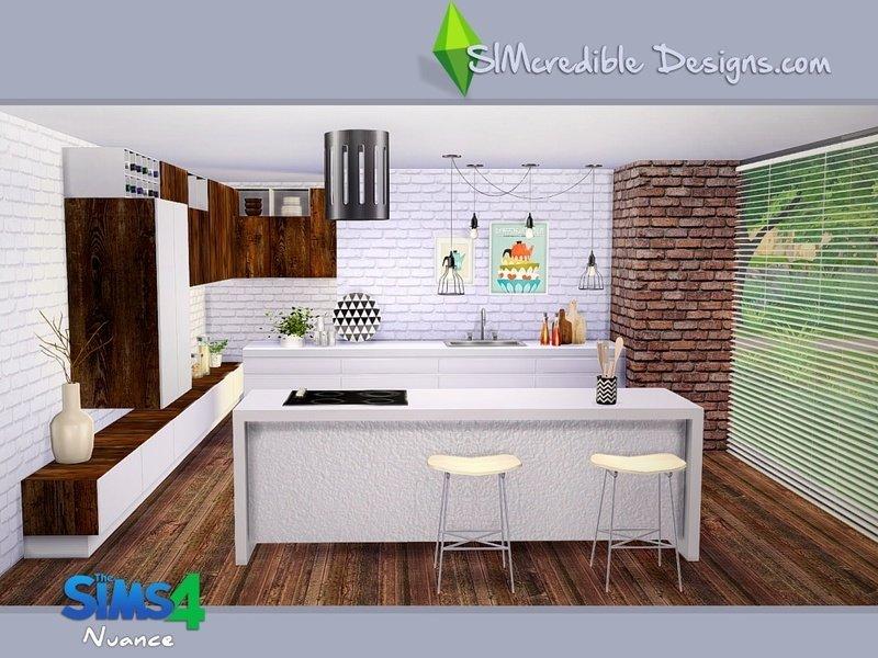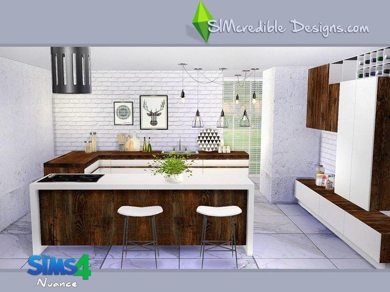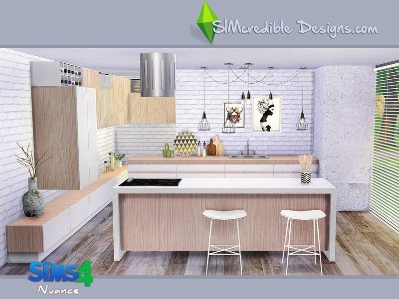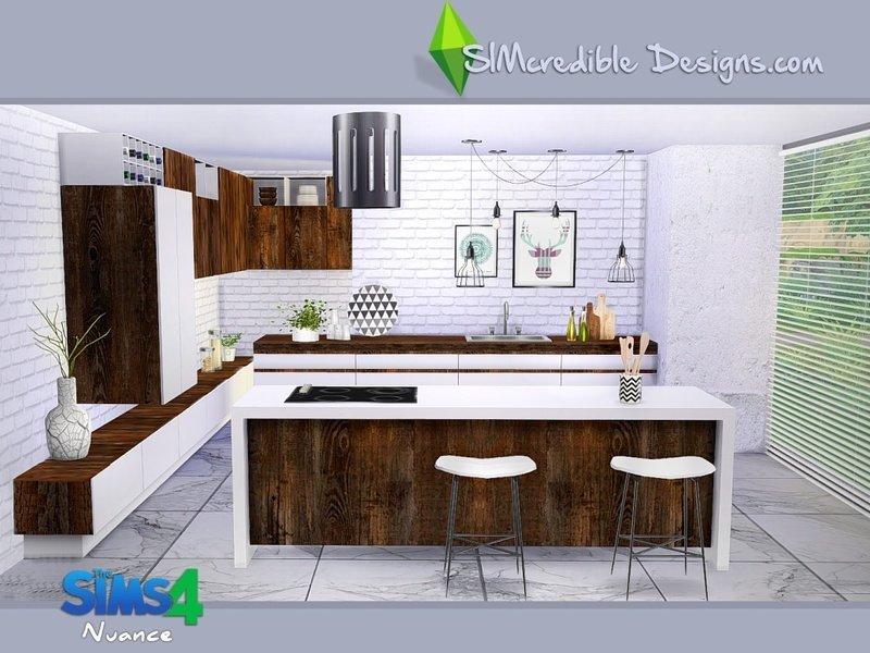 В наборе : Высокий стол с варочной панелью, винная полка, буфет, настенный шкаф, потолочные светильники, высокий табурет, маленький рабочий стол, разделочные доски на стену, кружки, холодильник, настенные картины, декоративные тарелки, набор специй, стул, стакан с приборами для готовки, вытяжка, напольная полка.