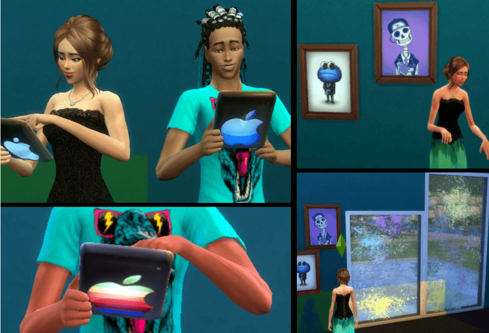 - Две необычные картины, которые вы можете повесить на любой стенке. Такие экспонаты, в виде скелета в смокинге и кепке, а также милого пушистого монстра, точно не подойдут скучным Симам. Стоимость набора картин – 4.000.