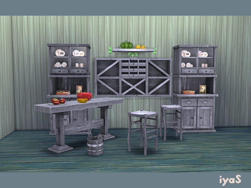 В наборе: Буфет, кастрюли в форме помидорок, бутерброды из помидорок, полочки с листьями, ведро молока, высокий стул, обеденный стол, настенные шкафы.