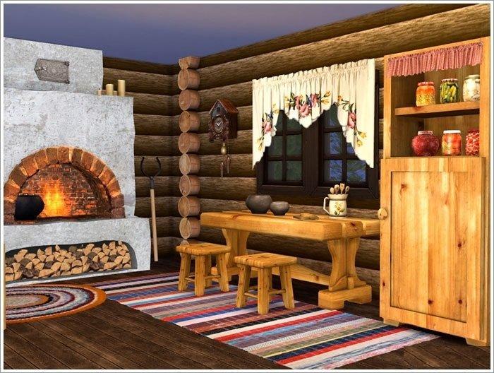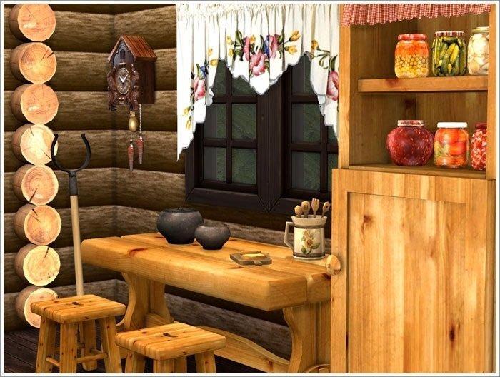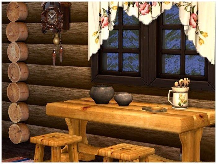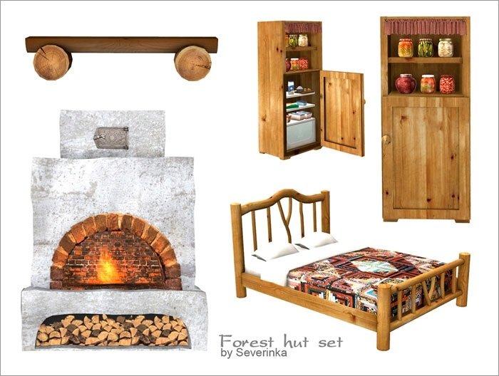 Скорее скачивайте изумительный кантри-набор «Forest hut» от Severinka из 17 предметов. Здесь все для обустройства уютной избушки: широкая кровать, деревянный ларь-холодильник, шкаф, полка, настенные часы с кукушкой, самотканые коврики и симпатичные шторы с цветочным орнаментом, стол, табуретки, печь-камин, чугунные горшки и ухват для них. Цветовых вариантов для мебели – два. Стены лесного жилища можно украсить декором, который тоже входит в набор.