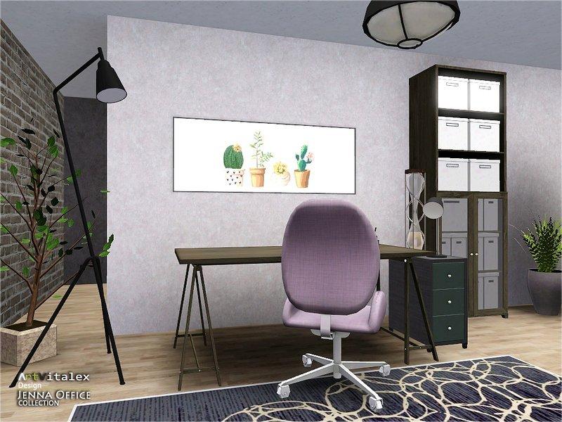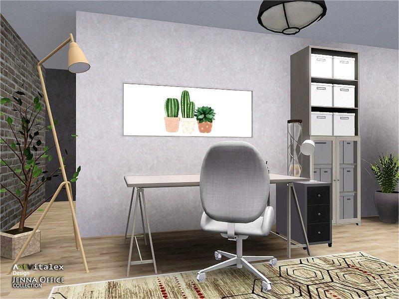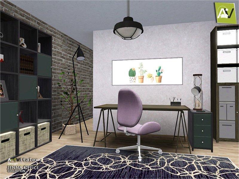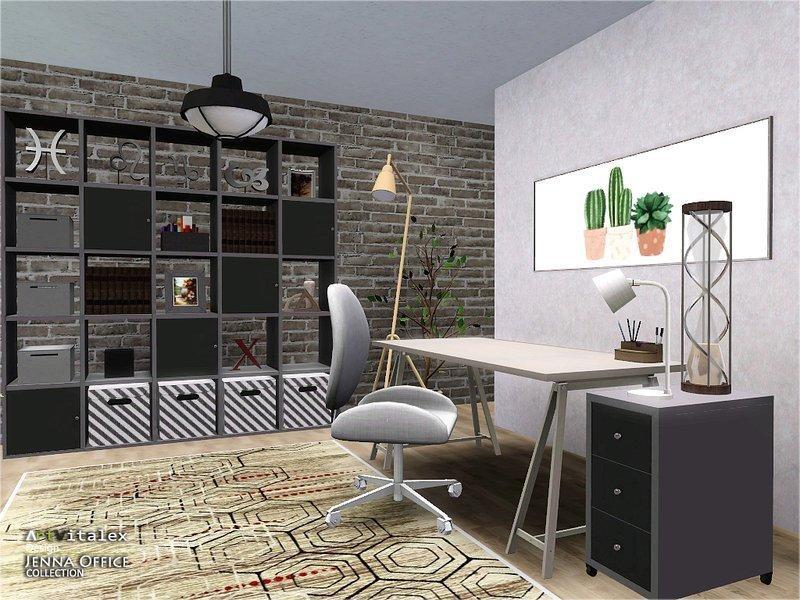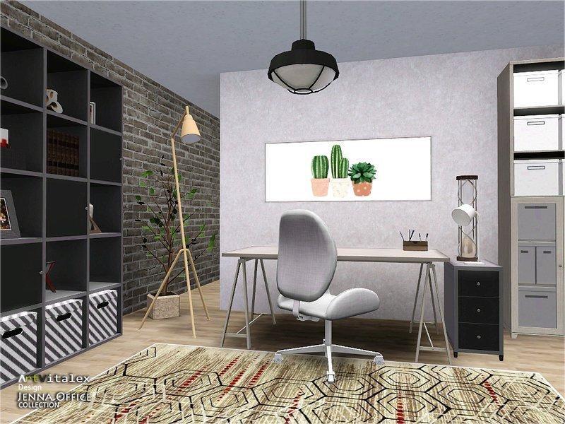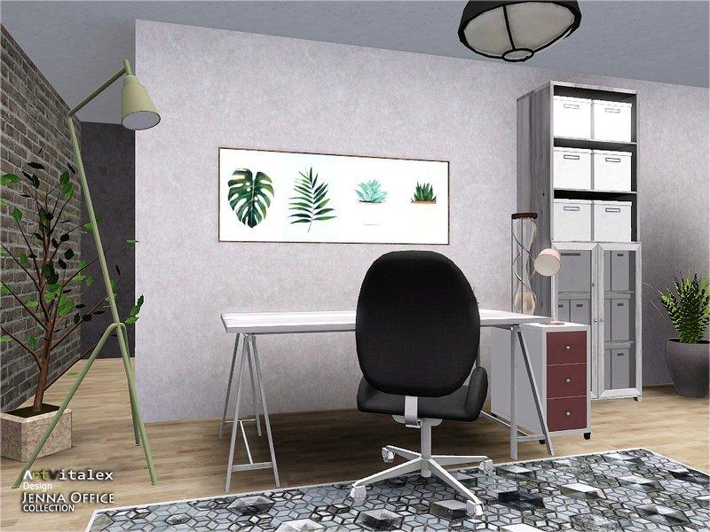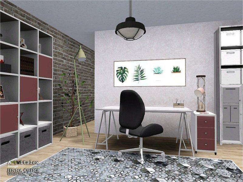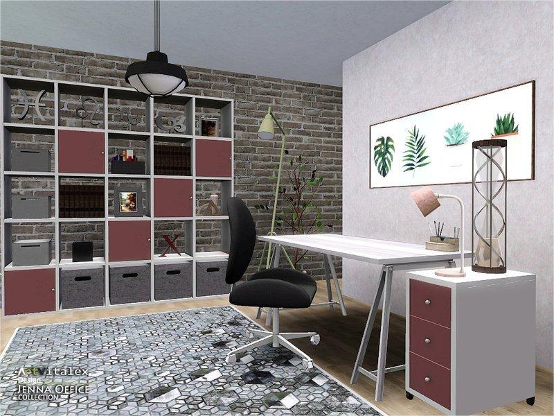 В наборе: большая напольная полка с множеством ниш, книжный шкаф, тумбочка, письменный стол, офисный стул, подставка для канц.товаров, коробка, статуэтка “Рыбы”, широкая картина, ковер, настольный и потолочный светильник.