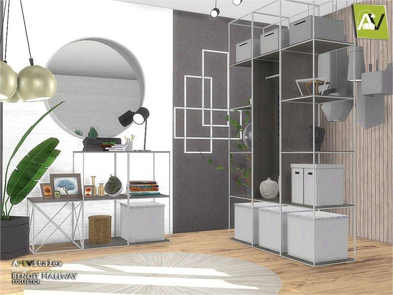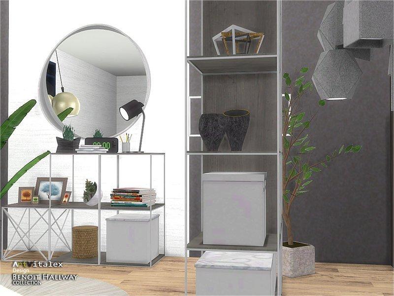 В наборе: шкаф с полками и вешалками, длинная полка, короткая полка, журнальный столик, круглое зеркало с неравномерной толщины рамой, декоративные кубы и вазы, ковер, настольная лампа, настенная и потолочная.