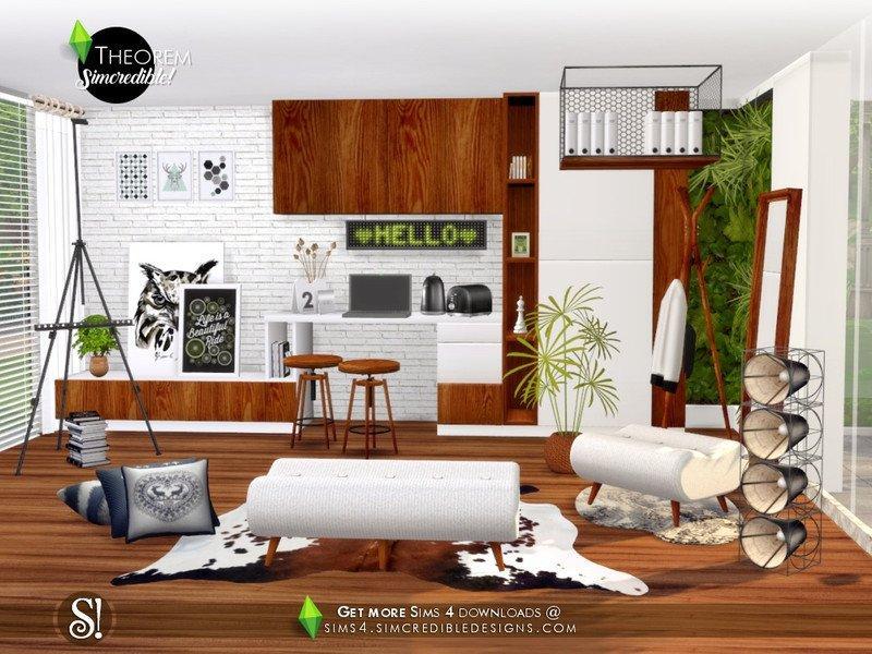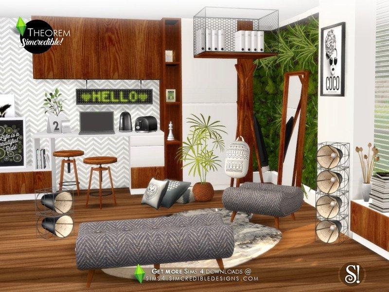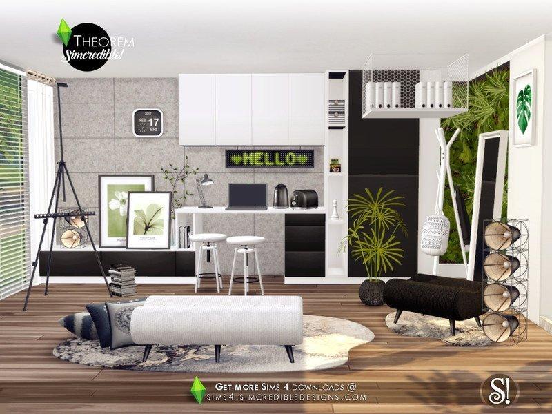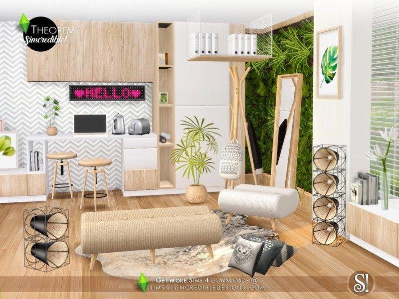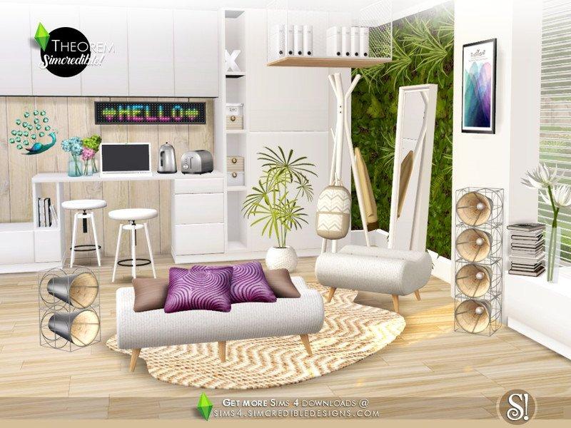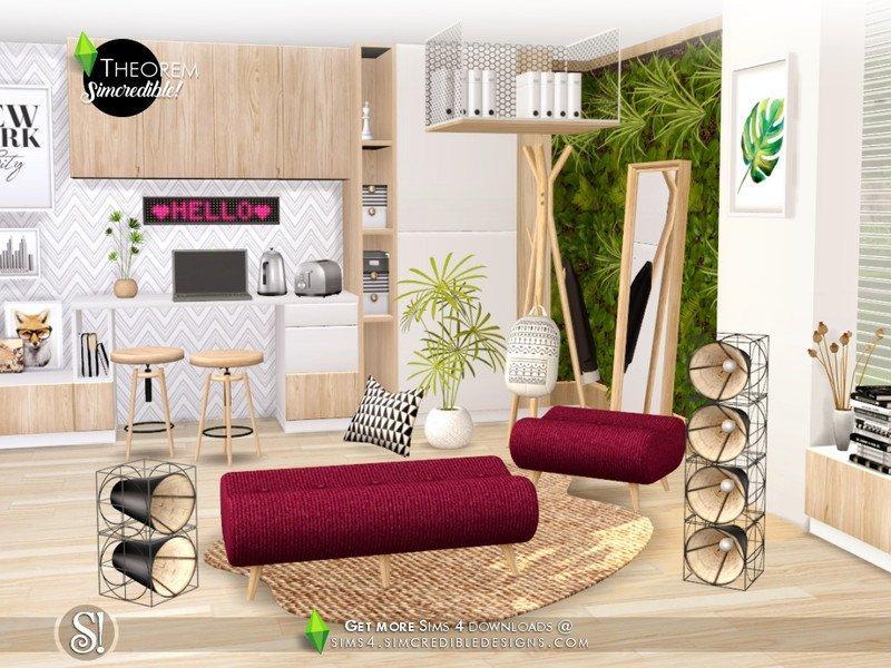 В наборе: Вертикальная напольная вешалка для одежды, стеклянные полки двух размеров, напольные лампы, которые можно устанавливать друг на друга, ковер, зеркало, диван, кресло, растения.