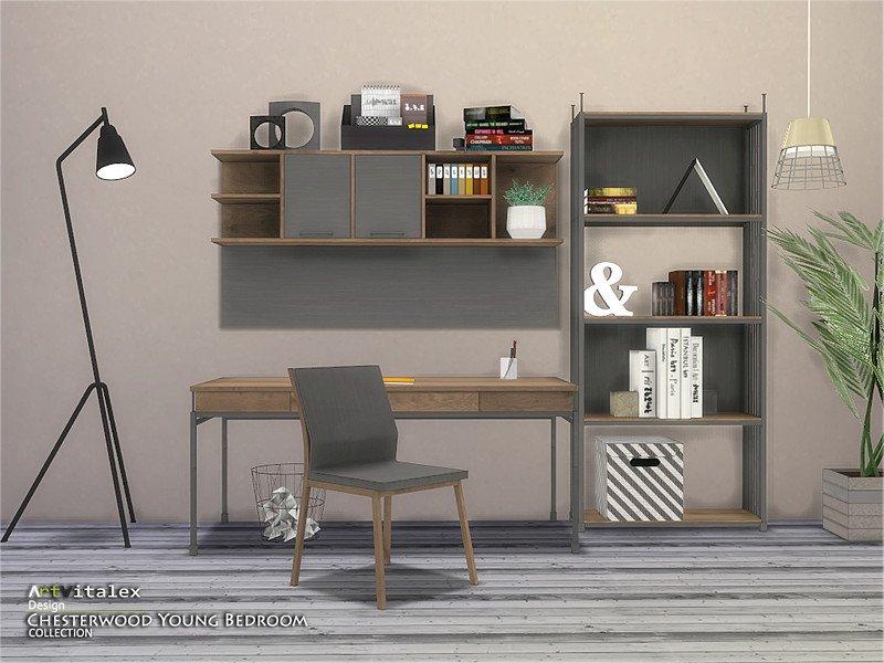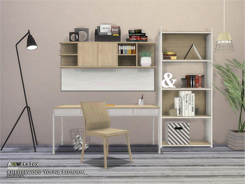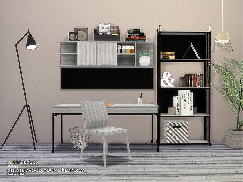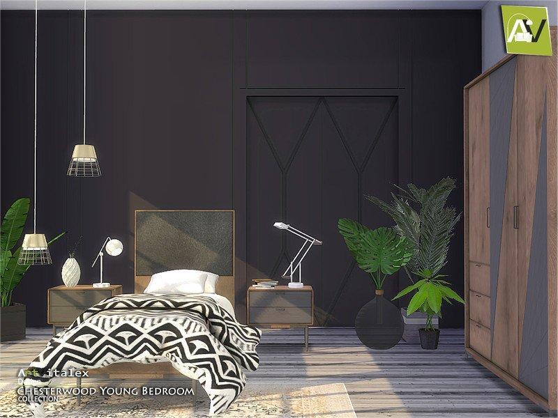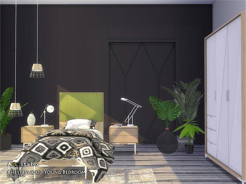 Простая и уютная спальня для одного взрослого персонажа или подростка. Кровать, растения, столик для работы…