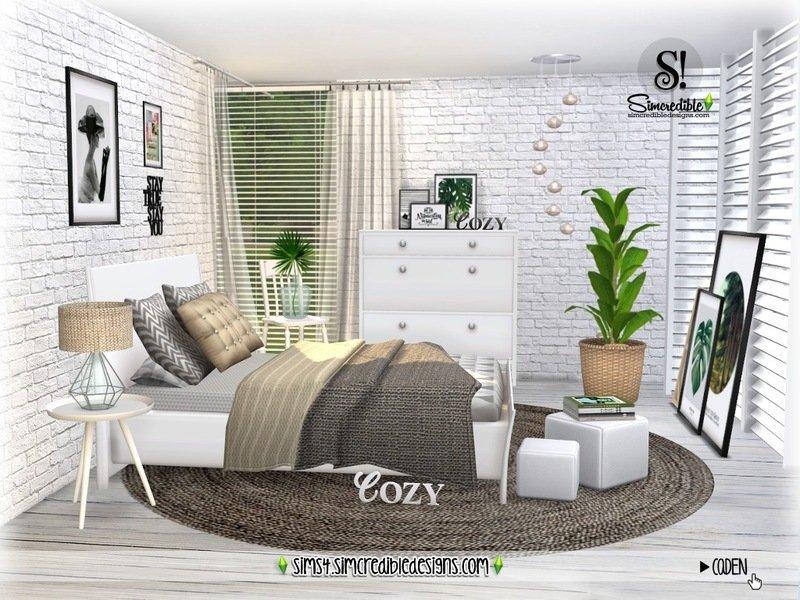 Простая и в то же время очень уютная спальня для ваших симов. В светлых тонах, оттененных деревянными элементами ваши персонажи найдут умиротворение и море комфорта.