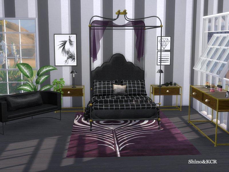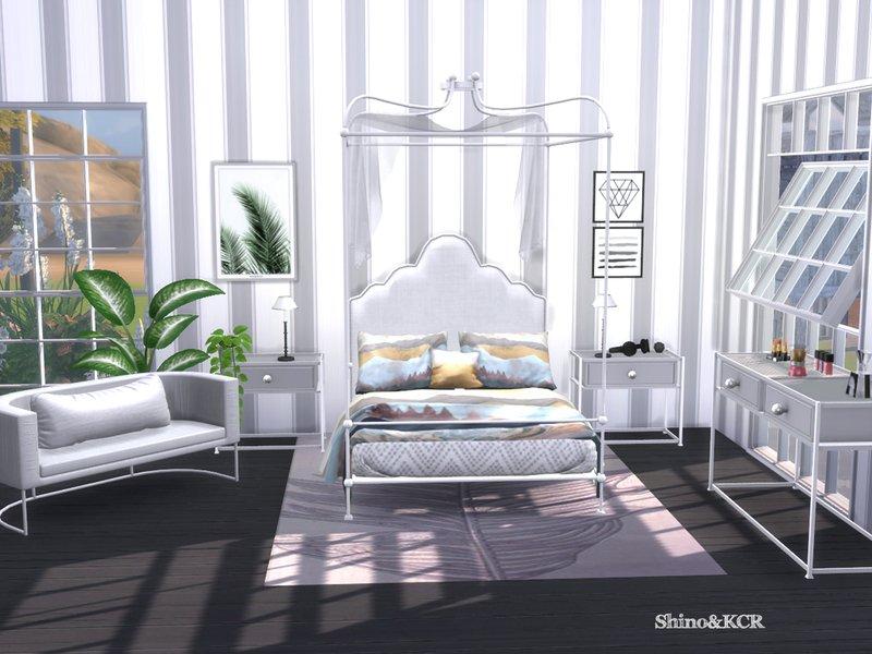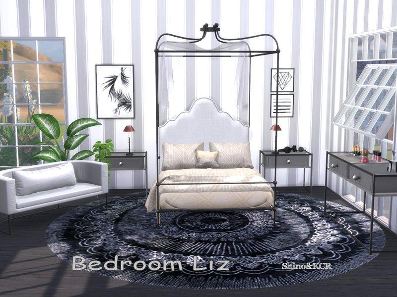 В наборе: большая кровать с балдахином, пледом, изголовьем и подушками; тумбочка, настольная лампа, двухместный диван, диванная подушка, кресло, комод, письменный стол.