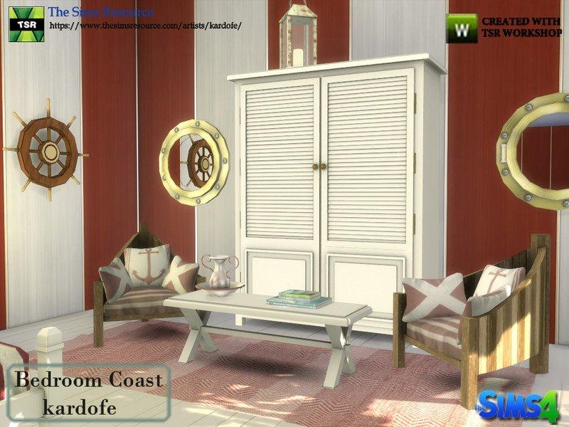 В наборе: Двуспальная кровать, стопка книг, кофейный столик, кружка, тумбочка, шкаф, ваза, фанфар, кресло, иллюминатор, чайник, коврик, светильник-субмарина, столик