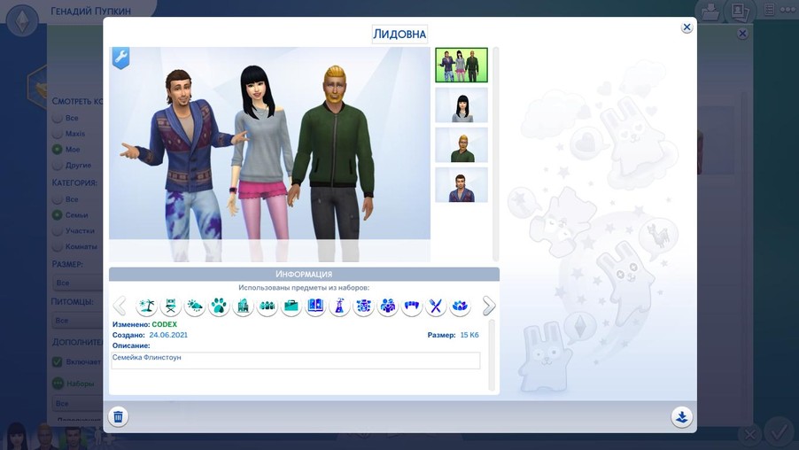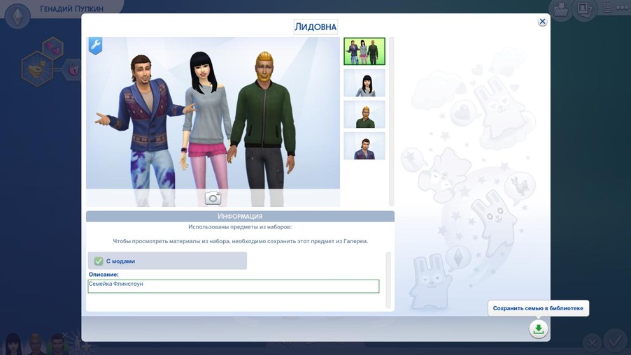 Далее откроется диалог, где можно задать описание семьи, или сохраненного персонажа . Нажмите кнопку — сохранить семью в библиотеку.
