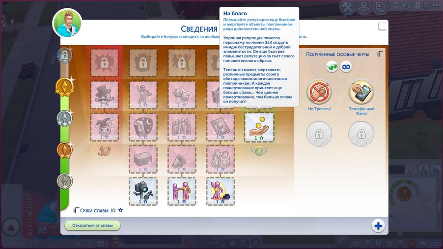 | 3. Почти знаменитость | Теперь за вами будут следить фанаты с прессой. Делайте селфи и обнимайте своих поклонников. Вам доступны новые бонусы, среди которых есть бонус репутации. |