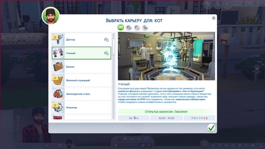 Перед вами откроется диалог выбора профессии. В списке профессий можно почитать описание каждой работы и узнать среднюю зарплату.