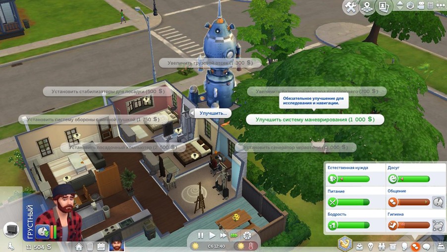 После покупки разместите площадку для строительства на своём участке. Далее жмите на неё и выбирайте — строить. Не забывайте удовлетворять потребности Сима. Процесс возведения ракеты будет довольно долгим.