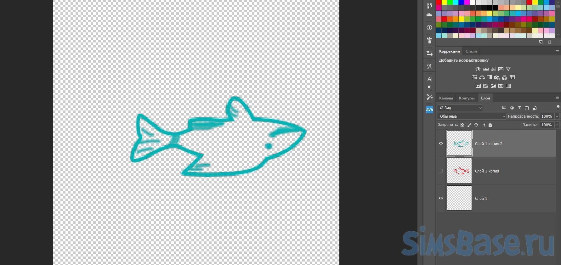 Добавляем новый слой, отключаем глазик у красной рыбки (на панели слоев) и на новом слое рисуем рыбку синего, голубого, любого цвета , но смотрящую теперь в противоположном нападении. Если голова красной рыбы была справа, то теперь нужно нарисовать слева. И снова поворачиваем на 180 градусов.