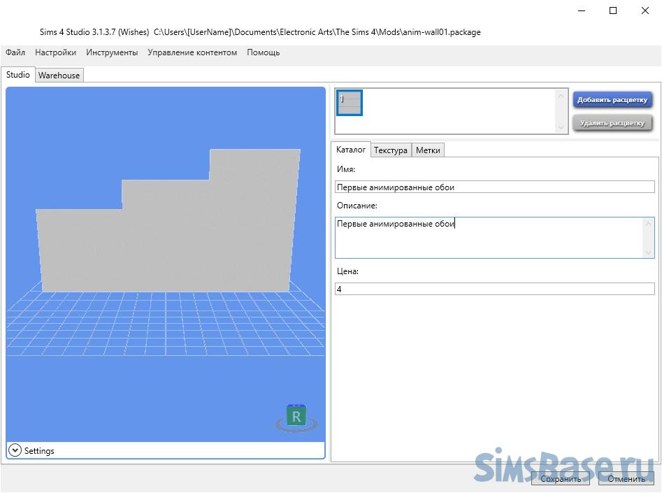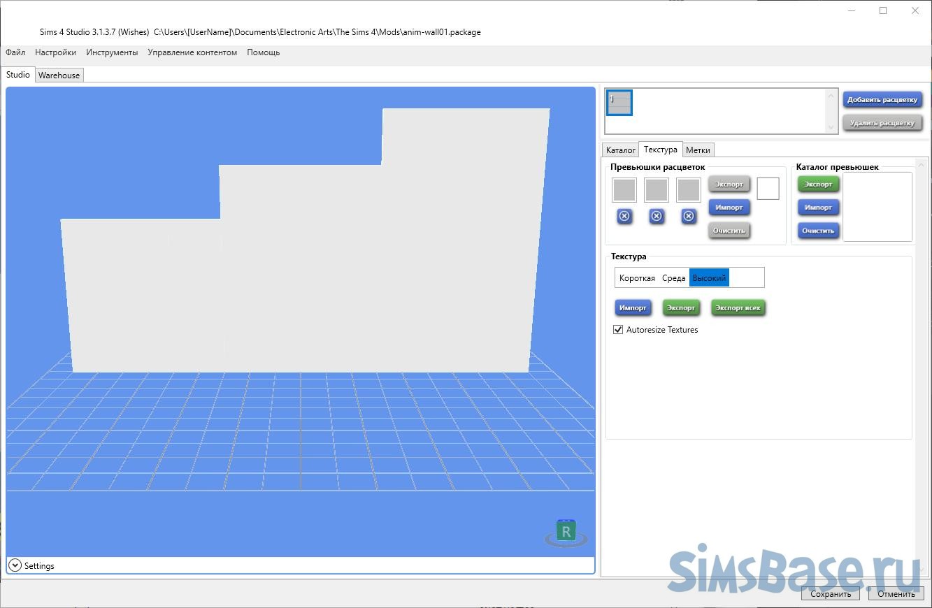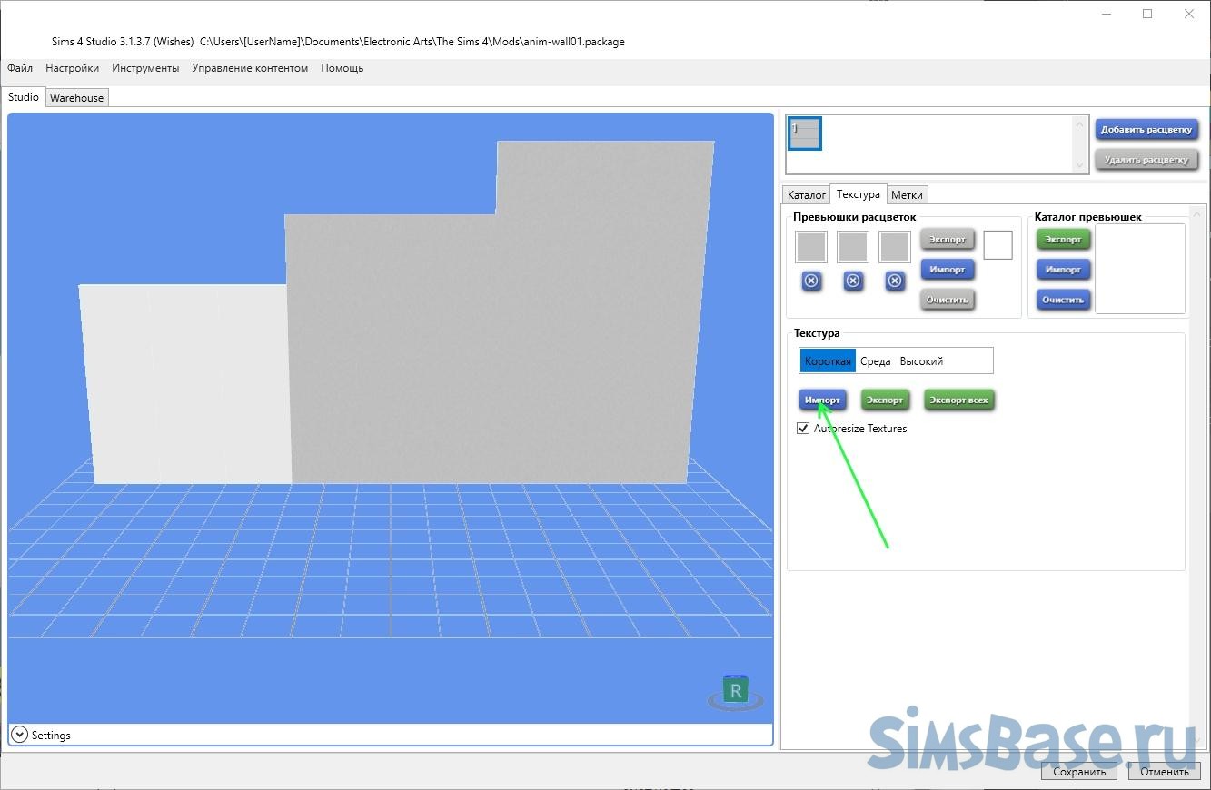 Возвращаемся в S4S и выбираем тип Текстуры, нажимаем Импорт и выбираем соответствующий по названию файл . Вы увидите, как кусочек стены стал… белым, т.к. мы его окрасили!