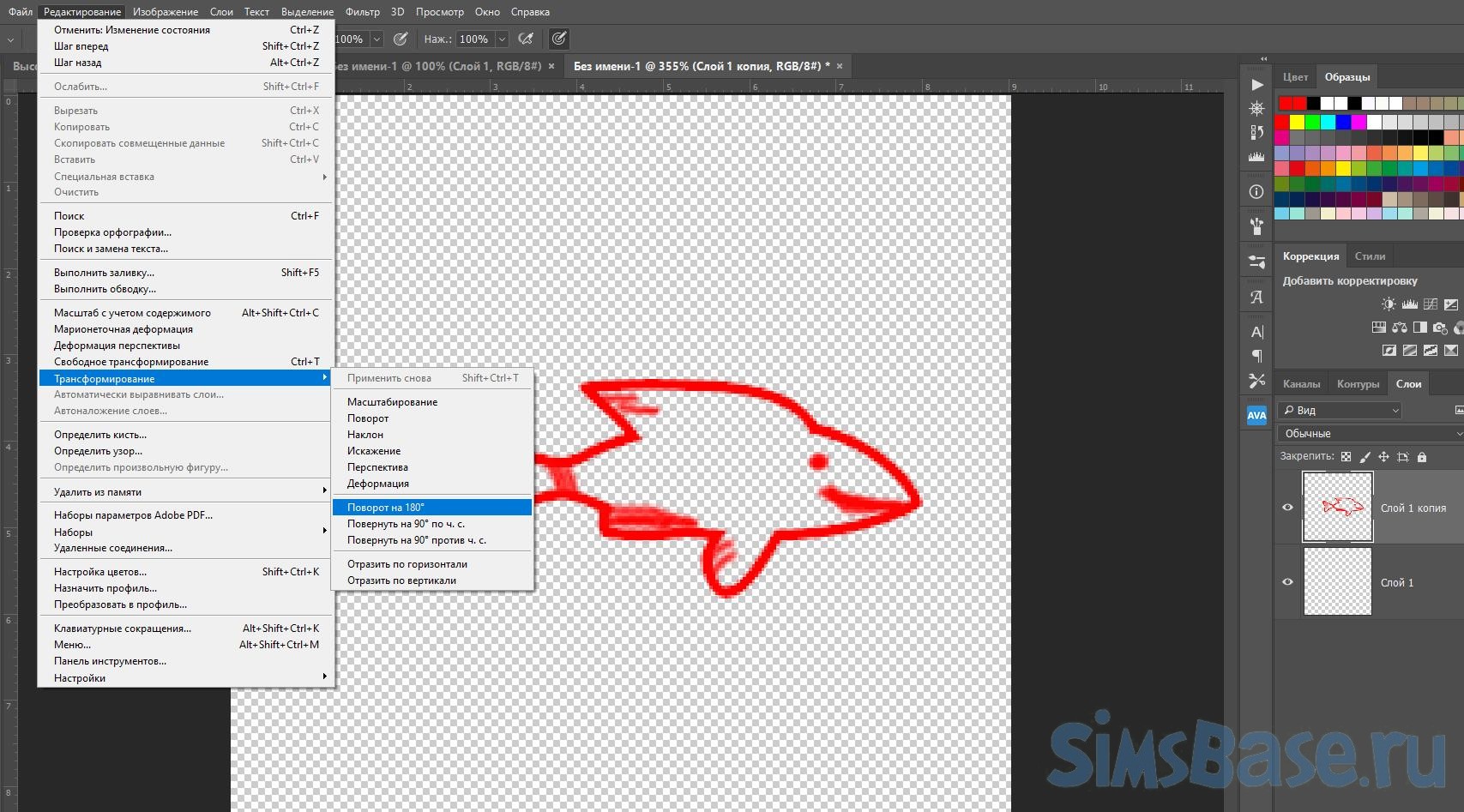 Поэтому, выделяем слой с рыбкой на Панели слоев (Layers) и переходим Редактирование (Edit) -> Трансформирование (Transform) -> Поворот на 180 (Rotate 180).