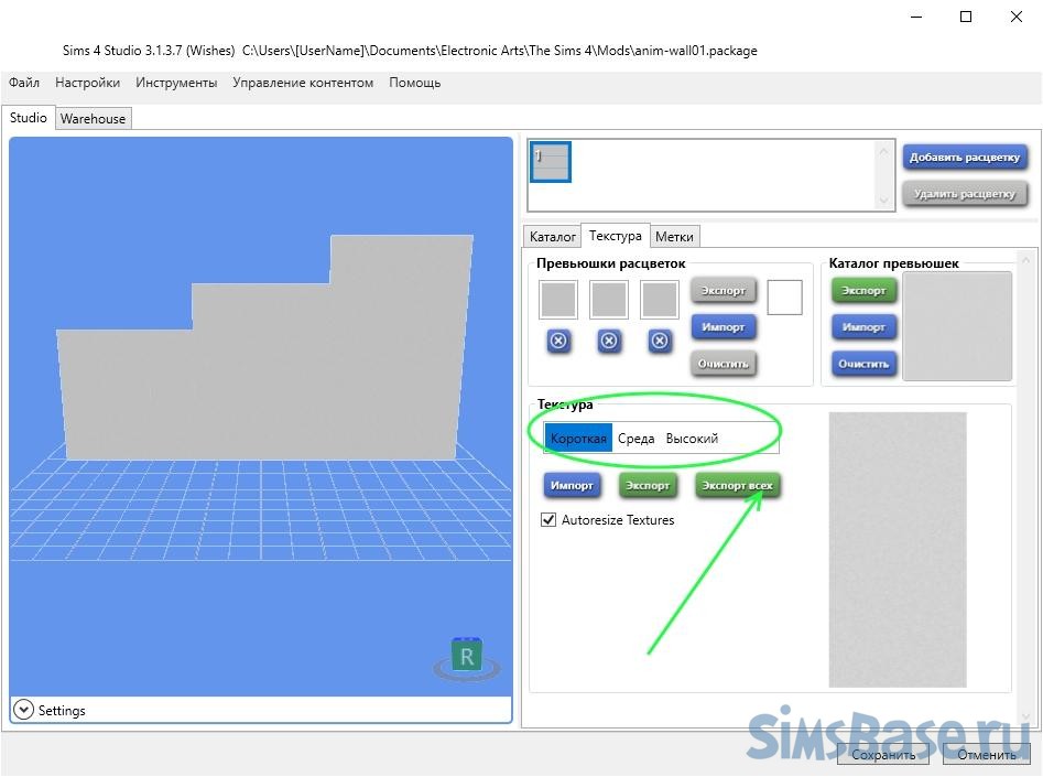 Но сейчас нас интересует вкладка «Текстура». Мы в окне просмотра видим лесенку из стен. Это три разные текстуры , которые нам нужно обработать. Просто нажимаем кнопку «Экспорт всех» и сохраняем в удобном месте.