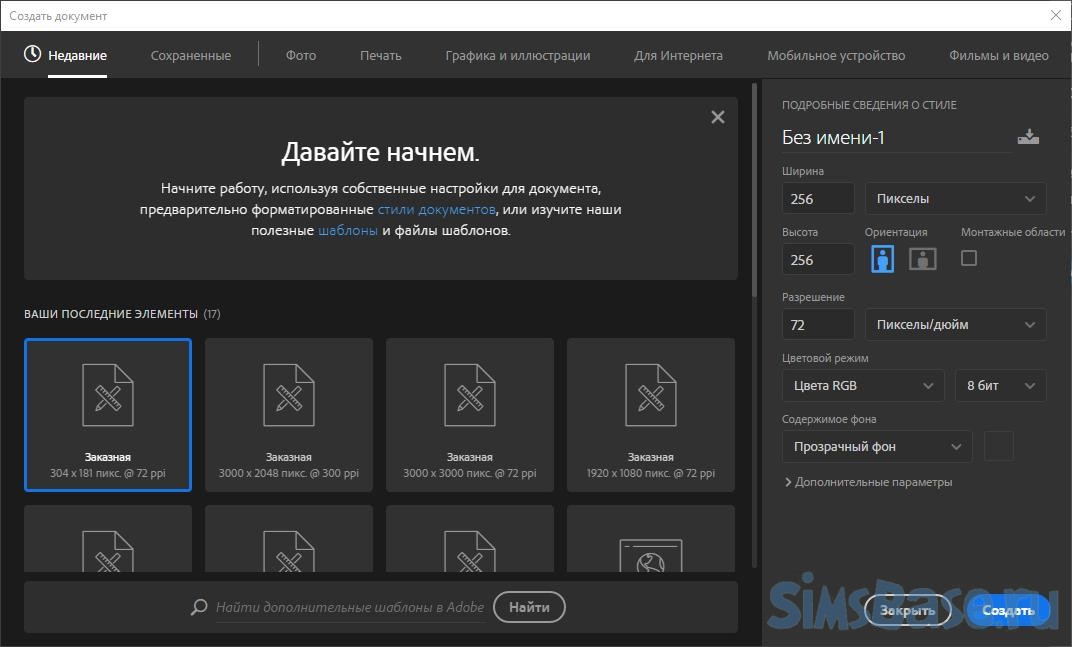 Создаем в Photoshop новый документ 256х256 пикселей с прозрачным фоном.