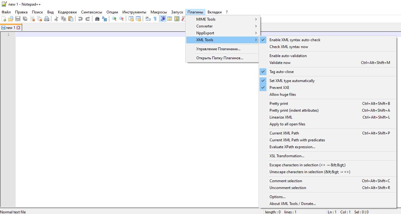 Нажмите Плагины -> XML Tools и удостоверьтесь, что галочки параметров у вас аналогичны нашим (проверка синтаксиса, автозаркытие тегов и пр.).