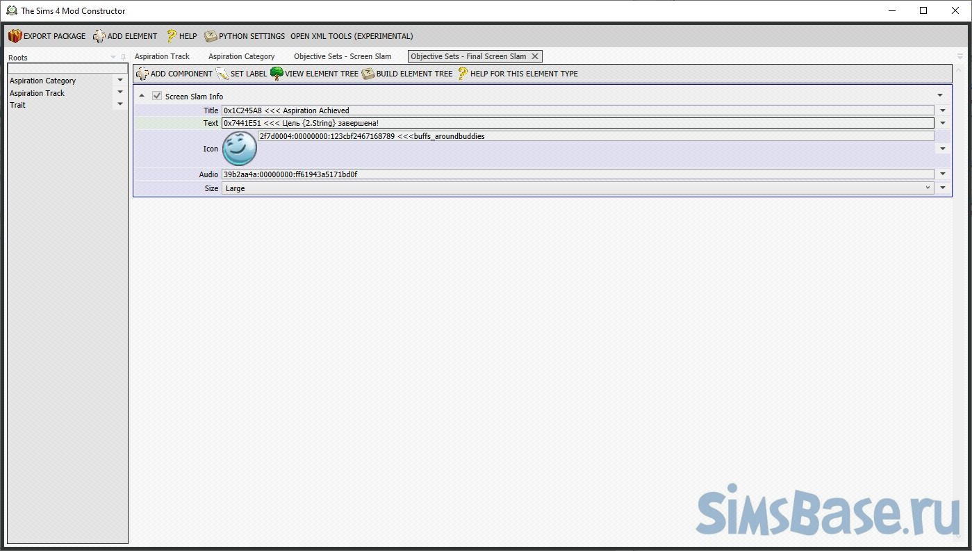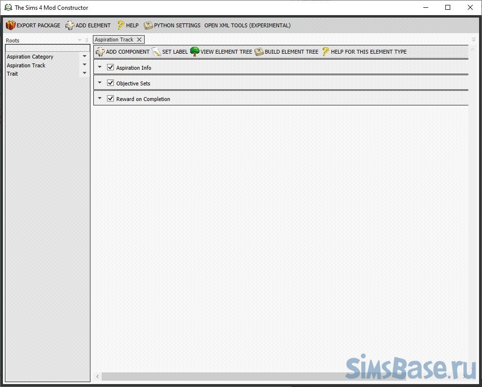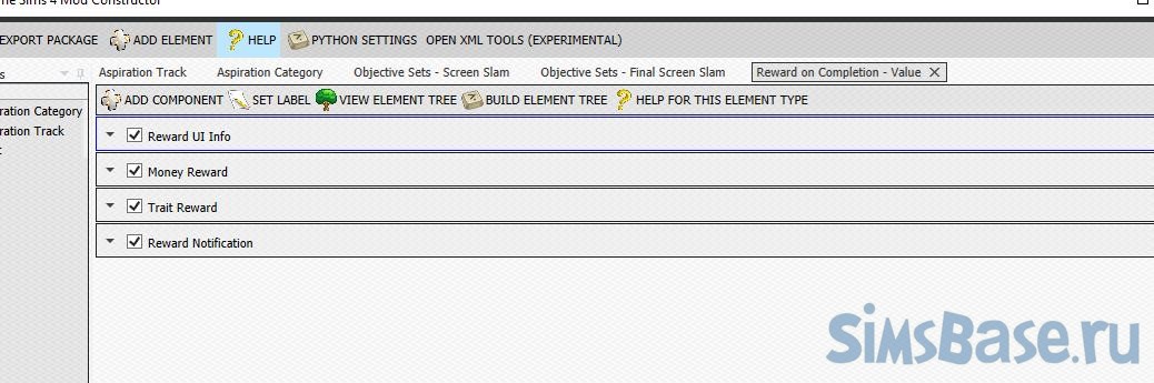 Переходим к Aspiration Track (этапам) и добавляем компоненты (Add Component): Aspiration Info (общая информация о ЖЦ), Objective Sets (задачи для каждого этапа ), Reward on Completion (награда за завершение).