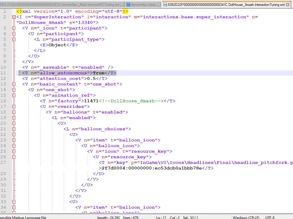 • Ищите взаимодействие, которое вы хотите сделать неавтономным или наоборот, автомномным (см. ниже). Взаимодействие Dollhouse Smash действительно раздражает многих, поэтому мы будем использовать его в качестве примера. Если вы не представляете о чем речь, то это автономное действие, когда сим приходит в детскую или на площадку и… ломает кукольный домик. Просто ломает при разных ЧХ.
