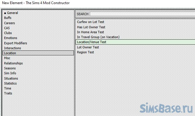 И так здесь пусто, поэтому снова Add Element (Добавить элемент) и выбираем место возникновения баффа. Location (Локация) -> LocationVenue Test.