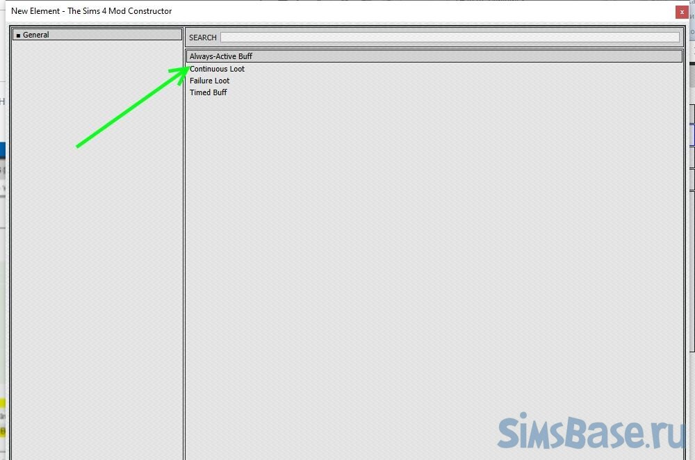 Открывается вкладка с настройками постоянного баффа . Нажимаем Add Element (Добавить элемент) и выбираем Action -> Continuous Loots.