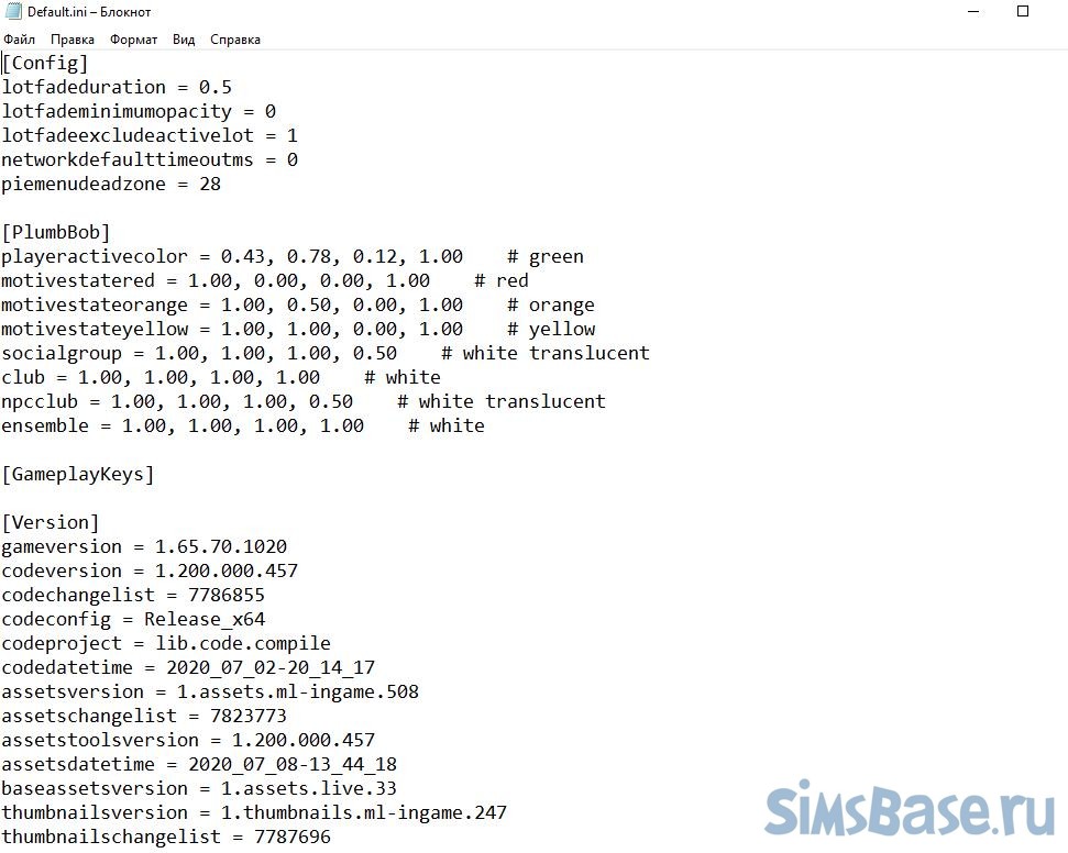 Default.ini – этот файл содержит несколько разделов , которые можно изменить. Раздел [PlumbBob] позволяет вам изменять цвет пламбоба ваших симов, как вам нравится. При этом мы бы рекомендовали не касаться значений в разделе [Version]. Этот файл обновляется автоматически в случае любого изменения в этом разделе (если у вас версия Origin).