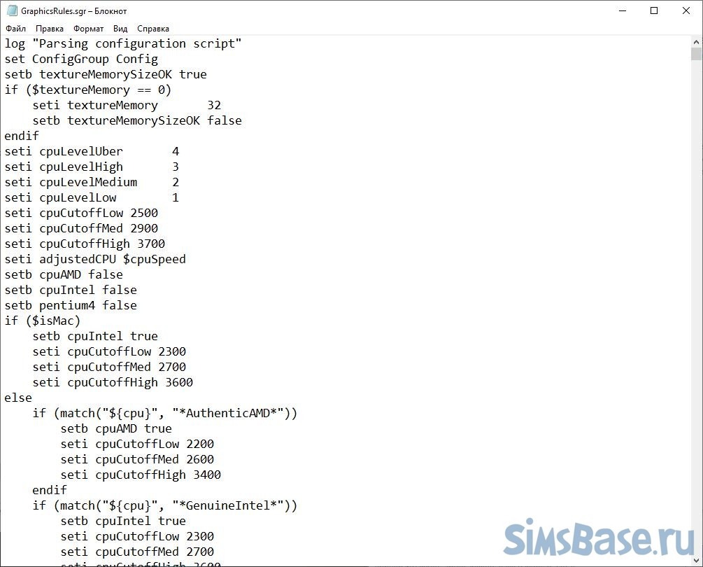 GraphicsRules.sgr – этот файл содержит множество правил об опциях игры. Мы рекомендуем изменять его только тогда, когда вы знаете, что делаете. Этот файл корректируется с каждым патчем , который вводит новые значения для существующих параметров или добавляет новые. Здесь собраны данные о графическом представлении игры, размере текстур, количестве шейдеров, свечениях, тенях и т.д., причем в отдельности: в CAS, в режиме жизни, на карте.