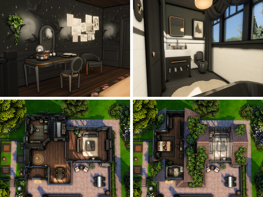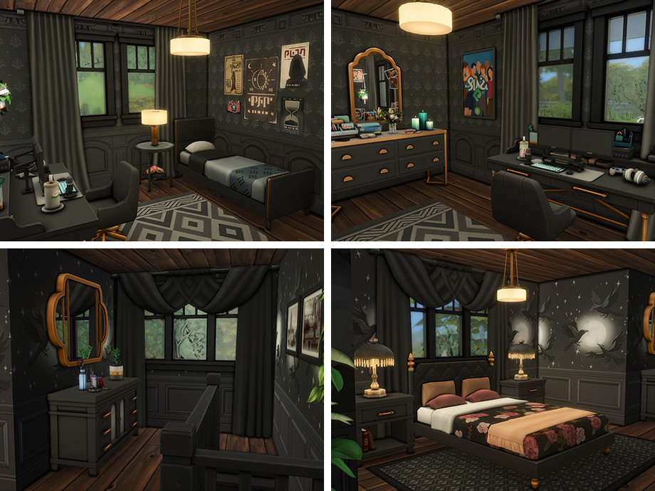 Внутри вас ждёт продуманная планировка с уютными комнатами, где тёмные акценты гармонично соседствуют с милыми деталями. Это отличный выбор для семейных симов, любителей готической эстетики или тех, кто хочет добавить в игру немного мистики. Дом выглядит потрясающе как снаружи, так и внутри — тёмная отделка, стильная мебель и атмосферное освещение не оставят равнодушными!