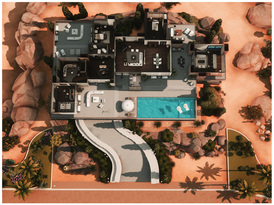 Представляю вашему вниманию роскошный современный особняк MM Modern Mansion 9 — идеальный дом для богатых и знаменитых симов! Этот потрясающий трёхэтажный особняк в стиле минимализм и хай-тек поражает своими масштабами и продуманностью каждой детали. Огромные панорамные окна от пола до потолка заливают интерьер естественным светом, открывая захватывающий вид на бассейн и ухоженный сад.