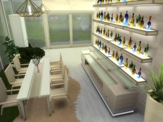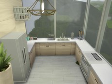 Современный дом на скале в белых и бежевых тонах. На первом этаже есть гостиная, столовая, ванная комната и кухня. На втором этаже есть спальня, детская и ванная комната. Кроме того, из кухни и столовой открывается потрясающий вид.