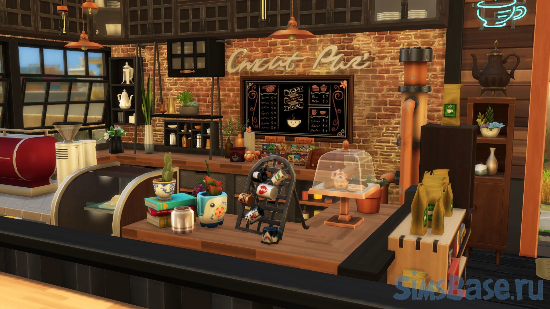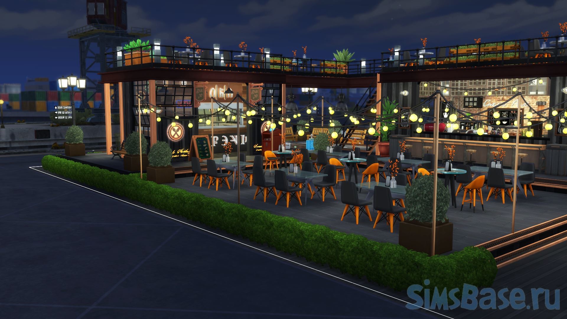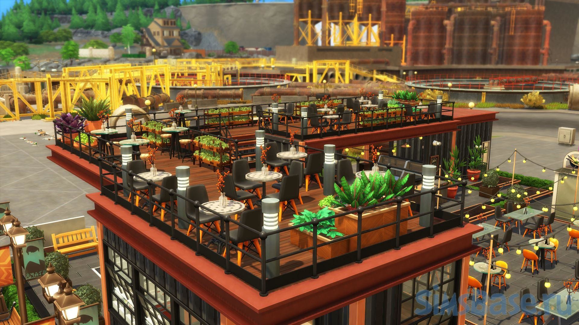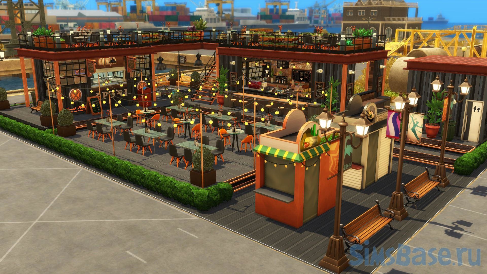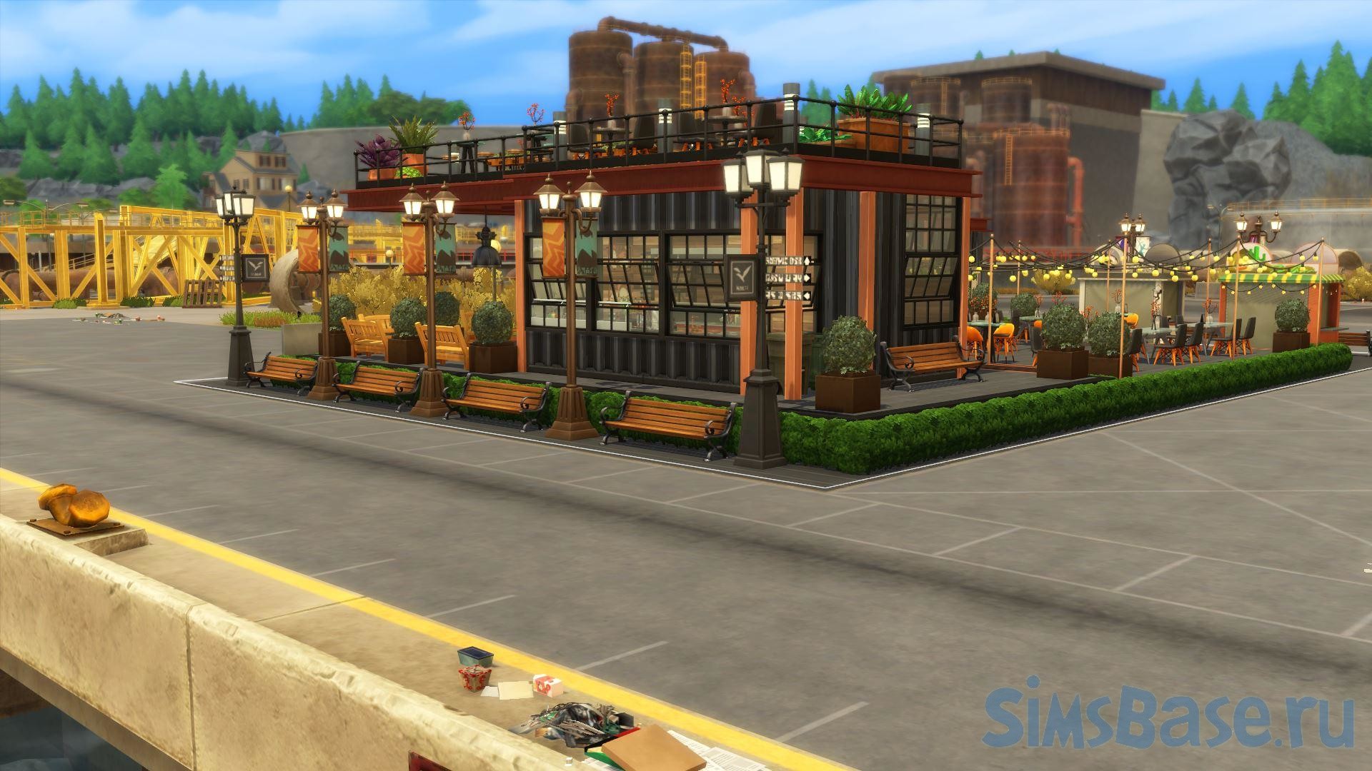 Парки общепита в индустриальном стиле – всегда одно из любимых мест для посещения в sims 4. Симы всегда хотят перекусить, а такие общественные места предлагают множество вариантов досуга. Этот общественный участок включает в себя скромный ресторан, а также уютное кафе. Ими можно управлять (свой бизнес), они двухэтажные, есть парковая зона небольшая. Также участок имеет свойства.