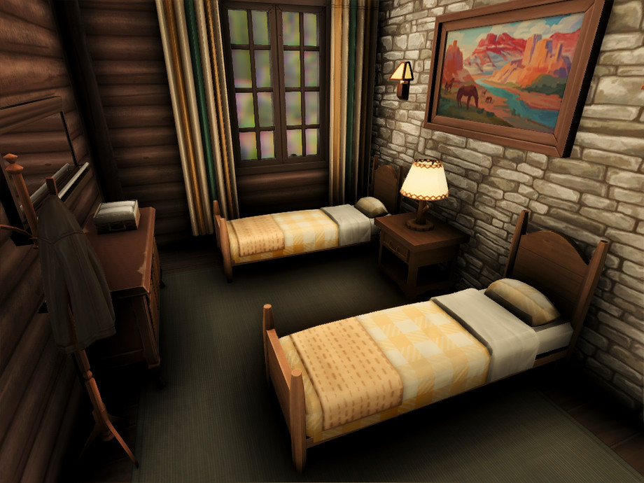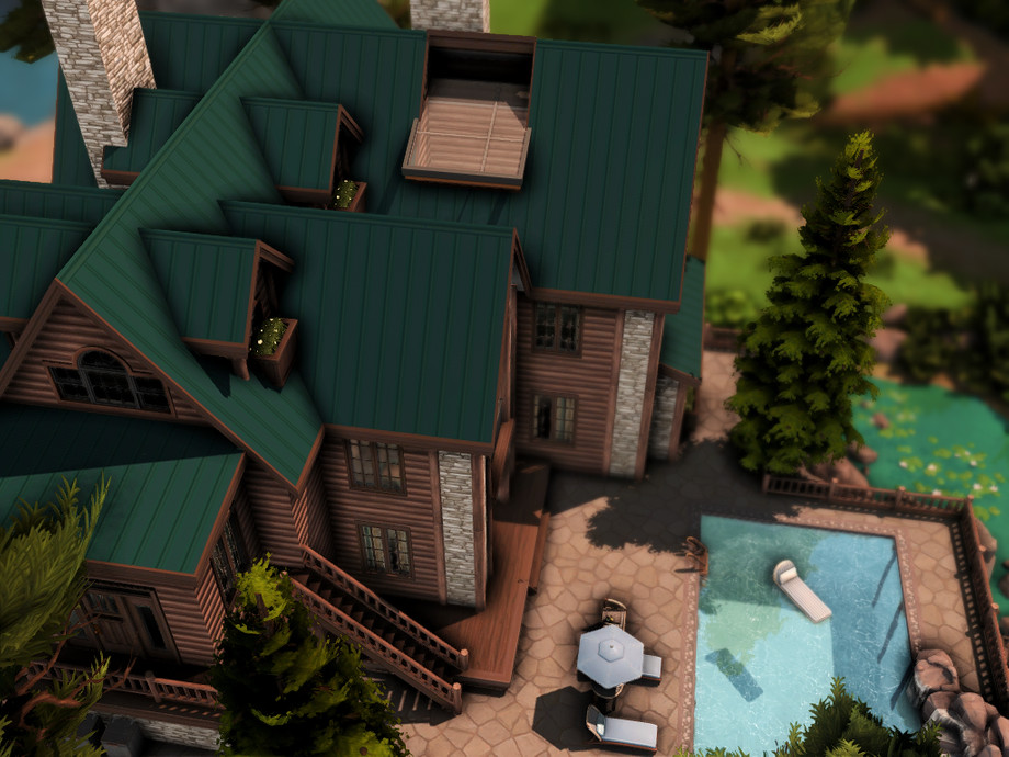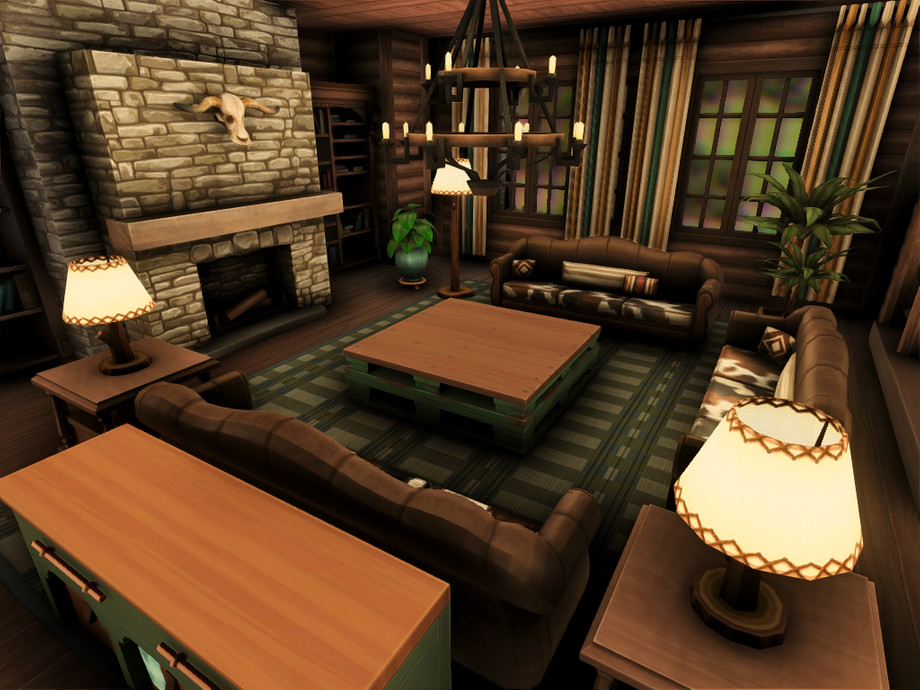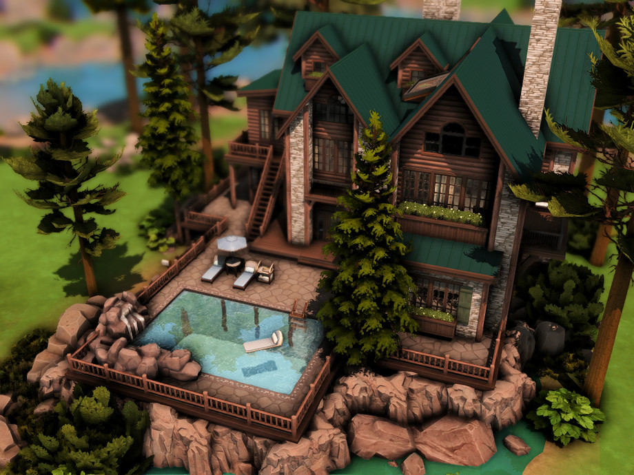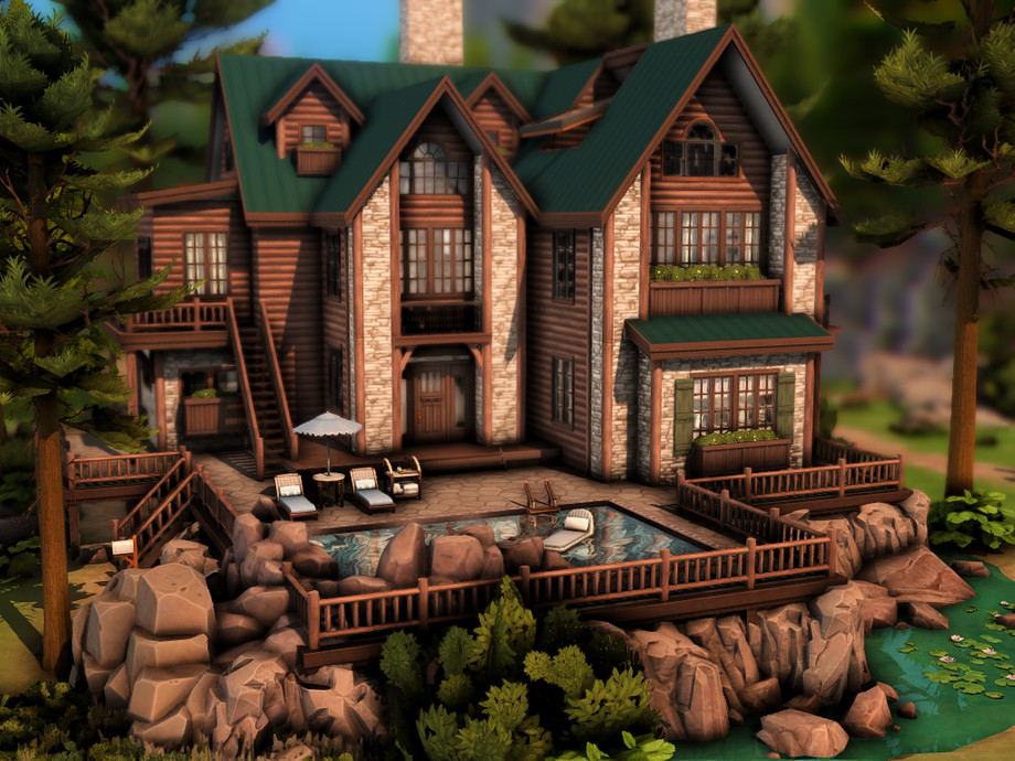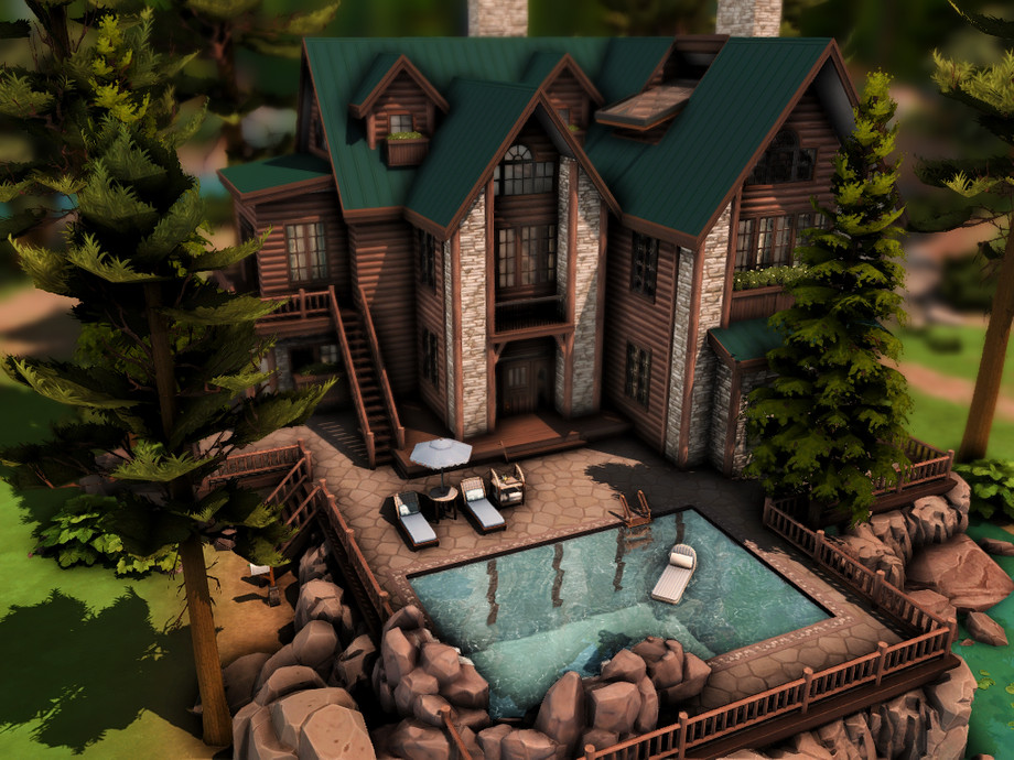 Лот размером 40×30, цена в игре — всего 107 872 симолеона. В доме три спальни и две ванные комнаты, два этажа, полностью меблированные и декорированные в теплом рустикальном стиле: деревянные и каменные стены создают атмосферу уюта и простоты. Просторная гостиная приглашает к семейным посиделкам у камина, а на заднем дворе сияет бассейн — идеальное место для летнего отдыха, игр с детьми и барбекю.
