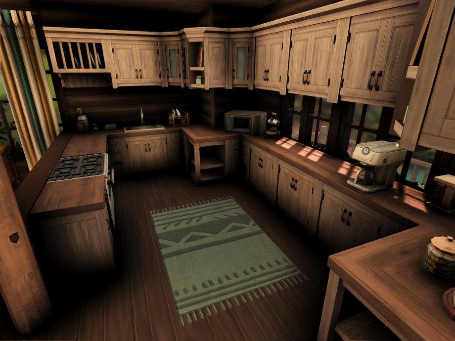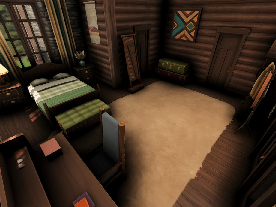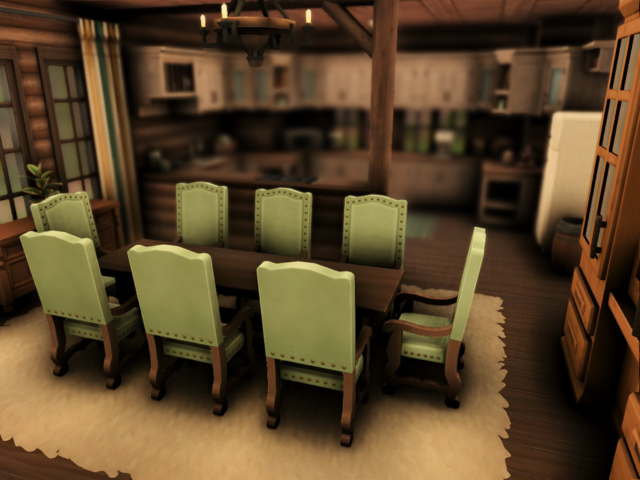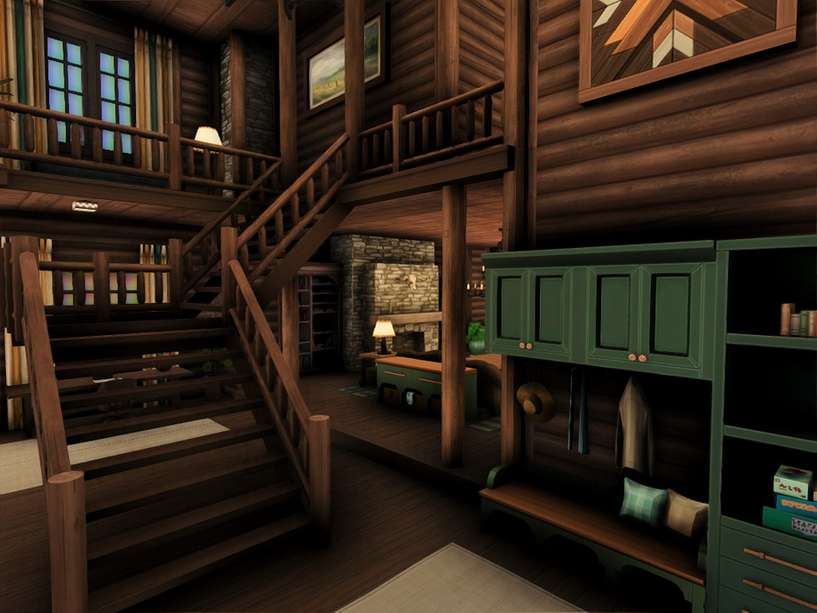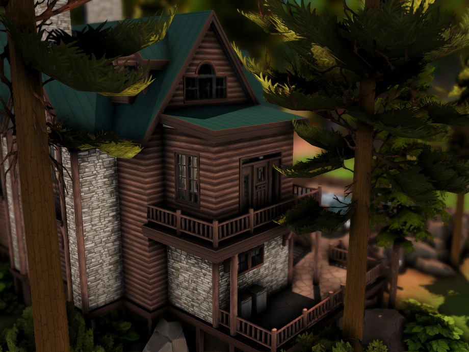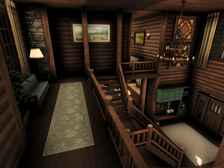 Лот размером 40×30, цена в игре — всего 107 872 симолеона. В доме три спальни и две ванные комнаты, два этажа, полностью меблированные и декорированные в теплом рустикальном стиле: деревянные и каменные стены создают атмосферу уюта и простоты. Просторная гостиная приглашает к семейным посиделкам у камина, а на заднем дворе сияет бассейн — идеальное место для летнего отдыха, игр с детьми и барбекю.
