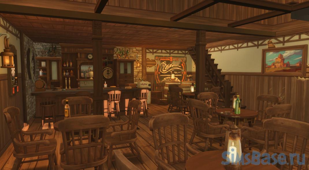 Классическая версия салуна или американского бара для охотников, ковбоев, солдат, рабочих времён Дикого Запада 19-ого века, которому отчасти и посвящено расширение Конное ранчо. Деревянная мебель, стилистический фасад, множественные кактусы, бочки, барные стойки, веранды и балконы, и многое другое. Участок имеет черты: Задиристая атмосфера, Место встреч собак, Компанейская атмосфера .