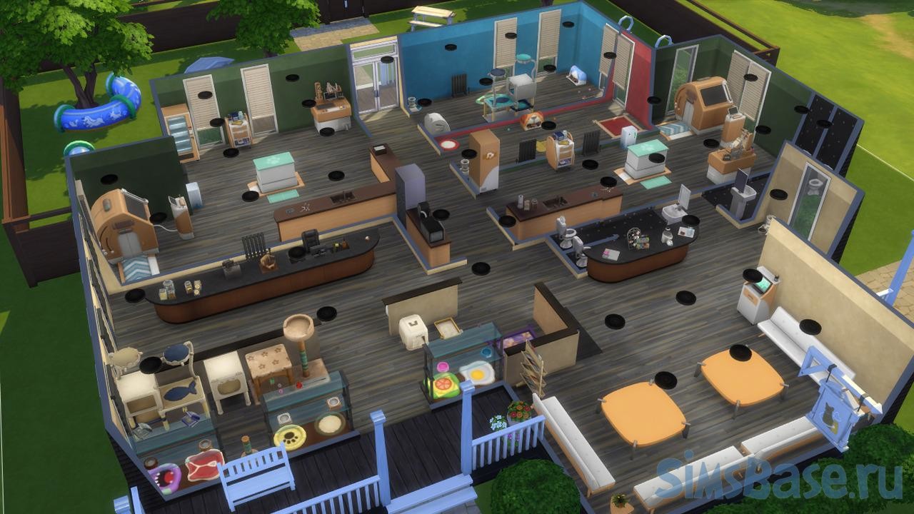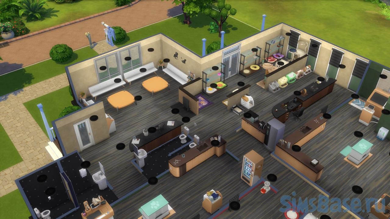Небольшая ветеринарная клиника порадует симов и их питомцев уютной атмосферой. Несколько приемных на двух этажах, лаборатория, комнаты ожидания и небольшие игровые уголки для кошек и собак – врачи будут рады оказать посильную помощь захворавшим животным.