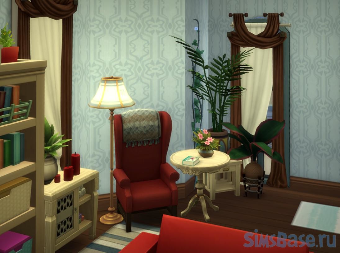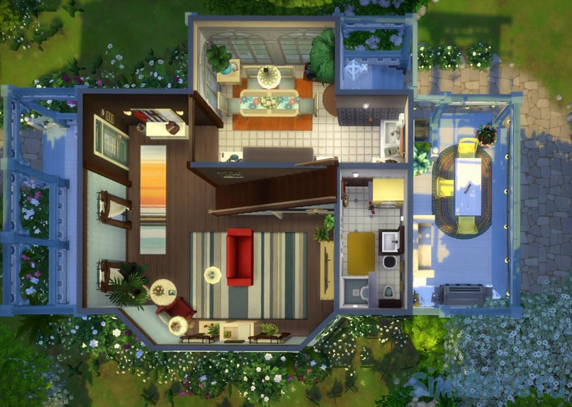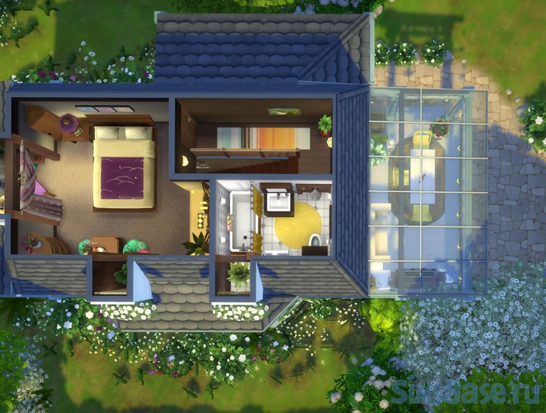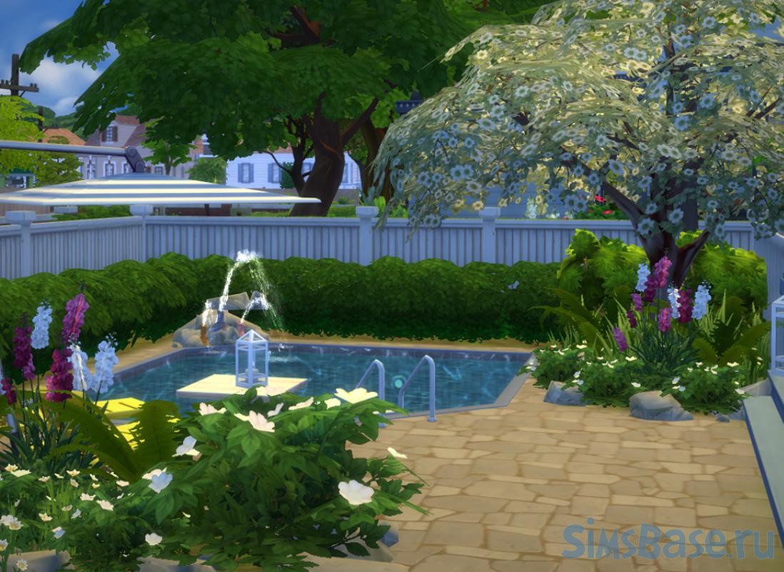 Небольшой уютный цветочный домик подходит для одного или пары симов. На первом этаже находится кухня с выходом в сад, стеклянный обеденный уголок, гостиная и санузел. На первом этаже находится спальня и второй санузел. Цвета фасада сохранены от оригинального домика в Виллоу Крик, добавлены декоративные арки, карнизы и колонны. В задней части дома находится зона отдыха с небольшим бассейном. Главный декоративный мотив сада – белые цветы, отсылающие к названию участка.