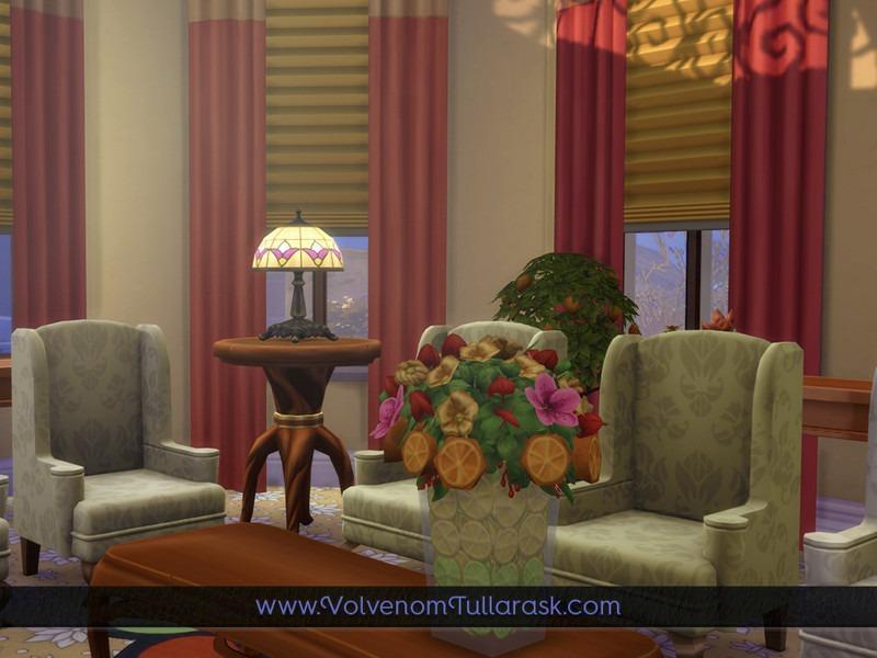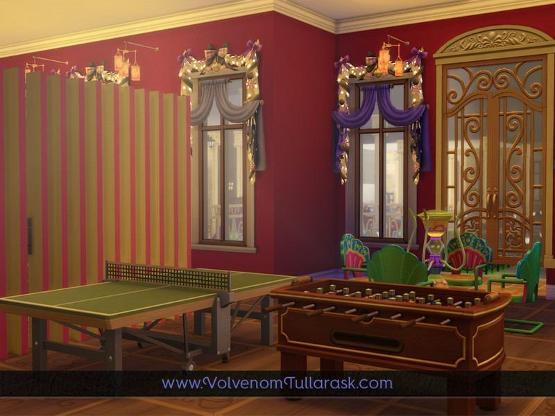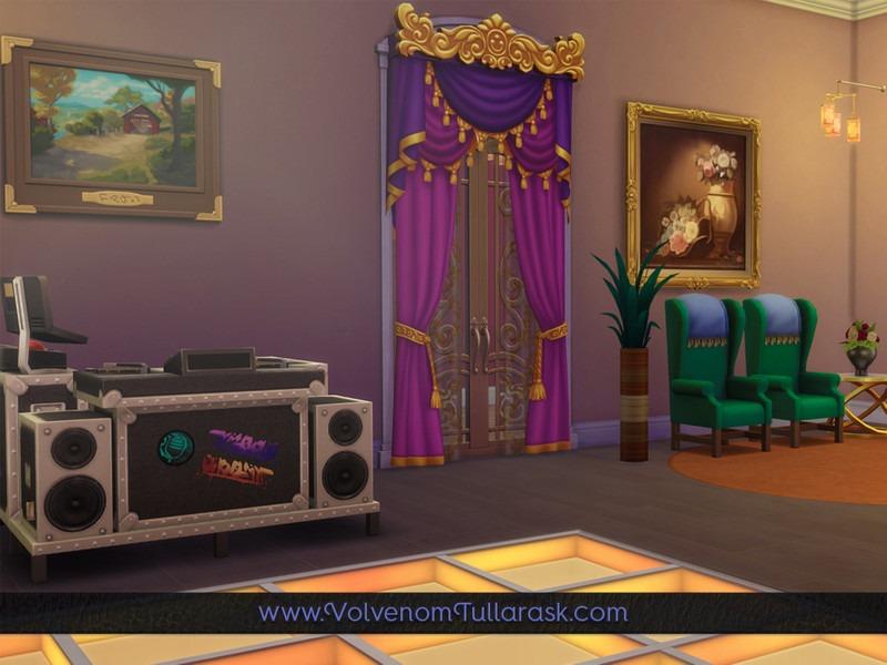Первый этаж: прихожая, столовая, гостиная, дамская комната (для женщин-симов с особенным интерьером), трибуна для дебатов, кабинет, 2 большие ванные комнаты и 1 туалет, пульт ди-джея, комната для занятий, игровая комната.